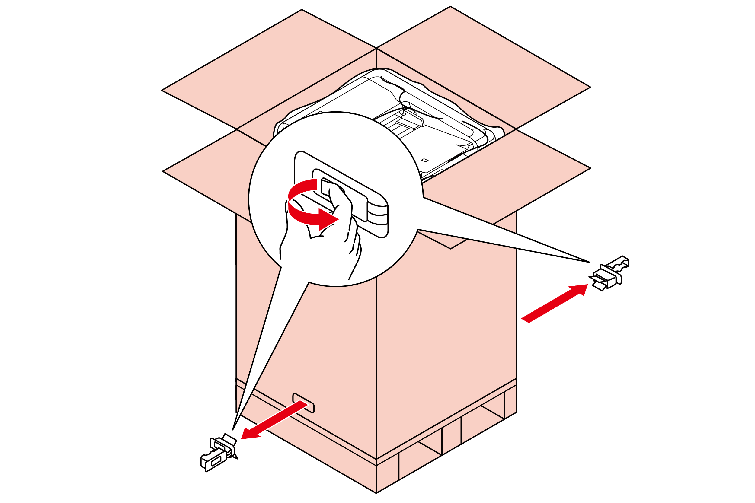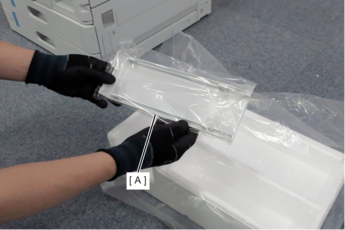 - 打开盖(A)并将运输固定件(B)存放在所示位置。