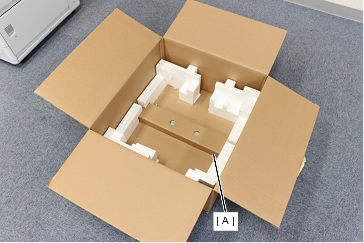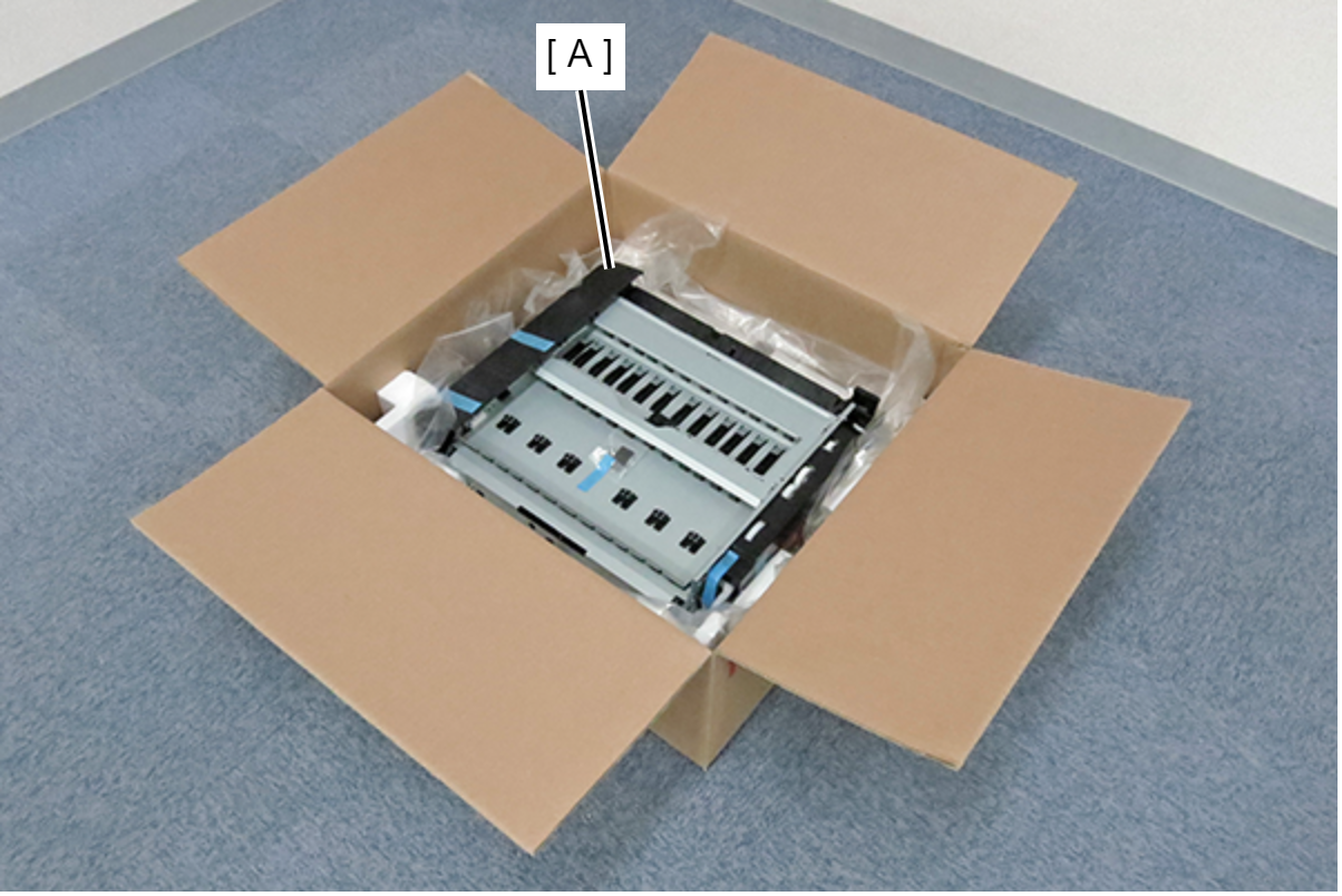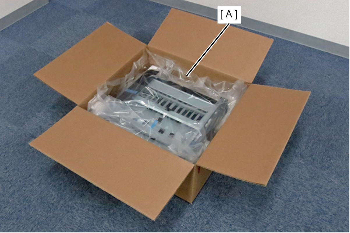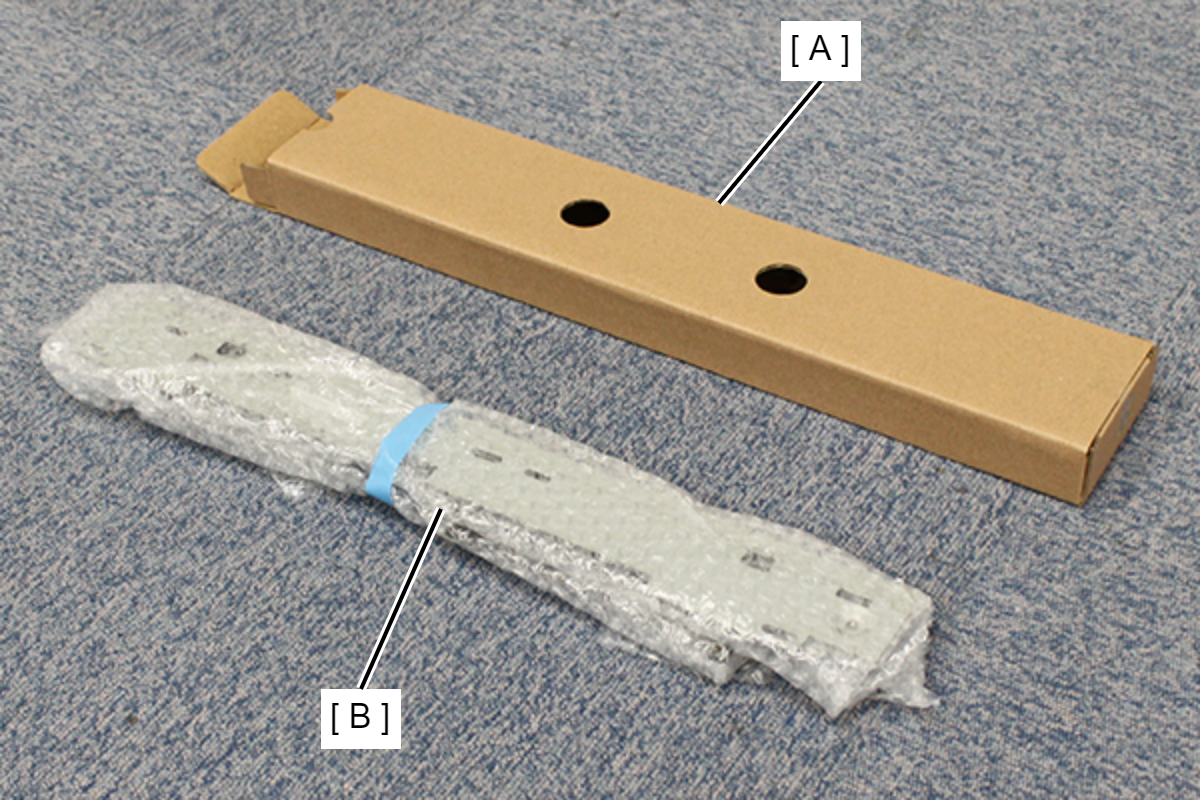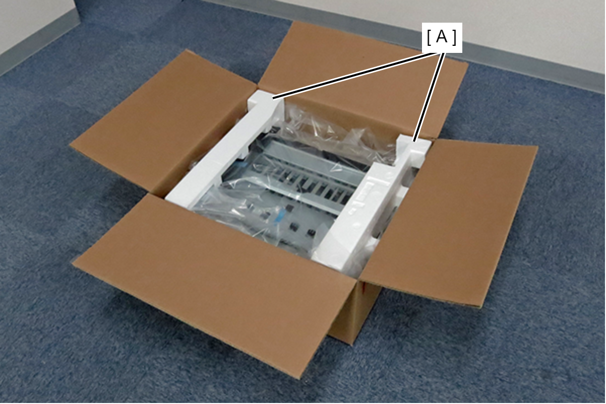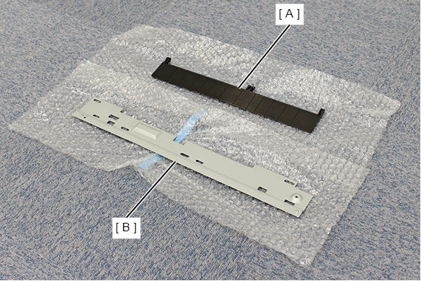 - 拆掉胶带,拆下气泡包装材料、FB导纸轨(A)和进纸位置调整板(B)。