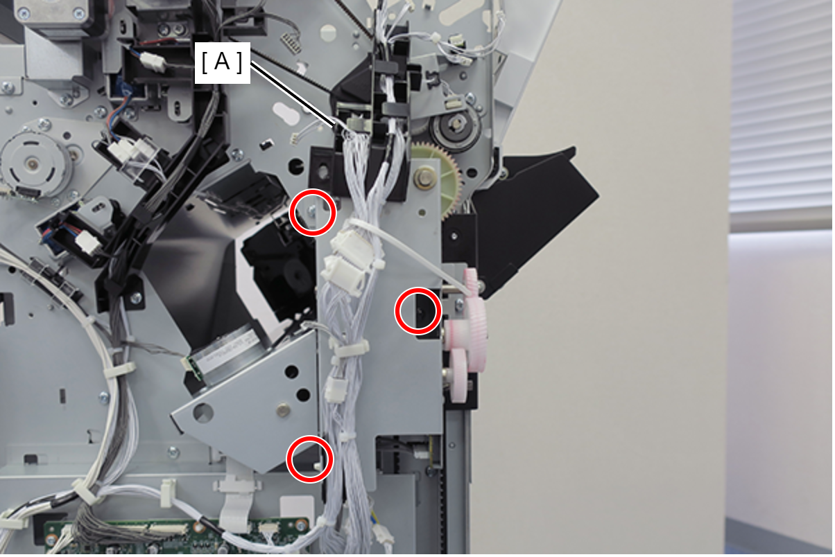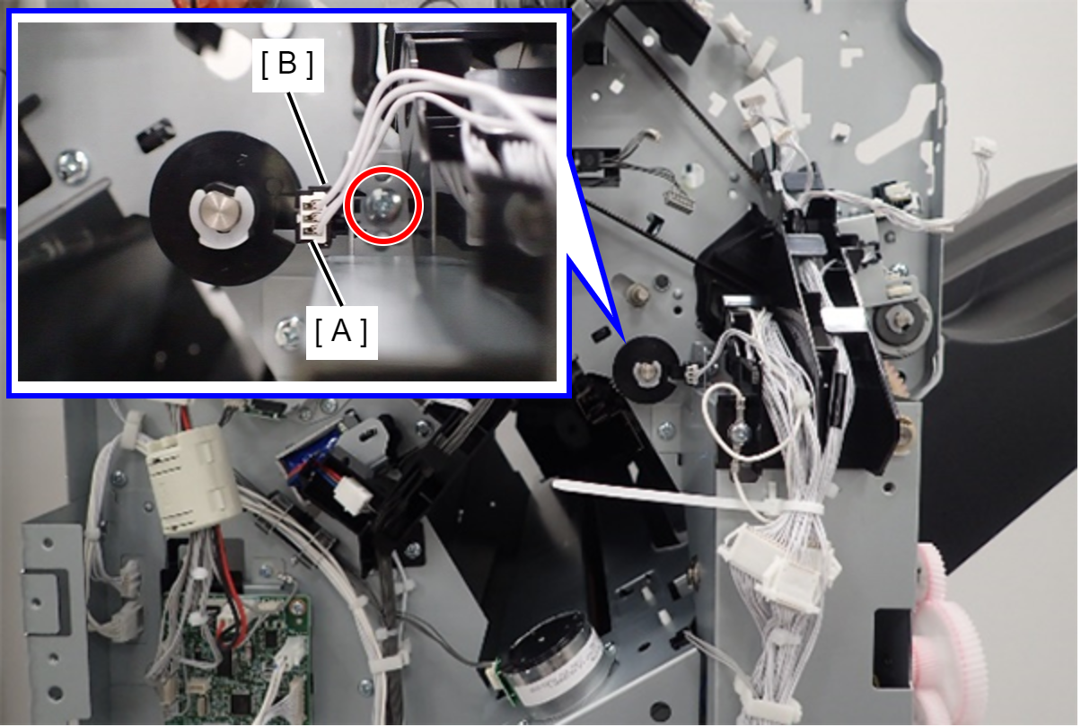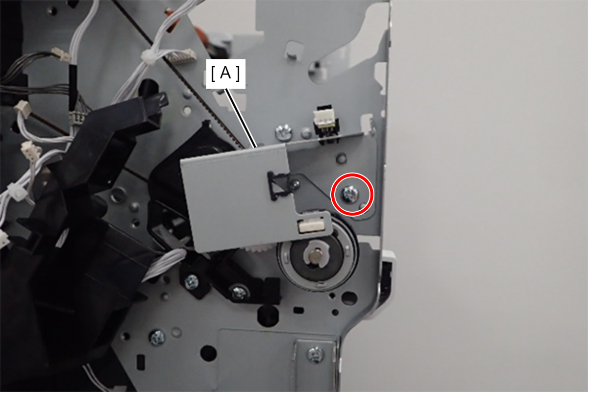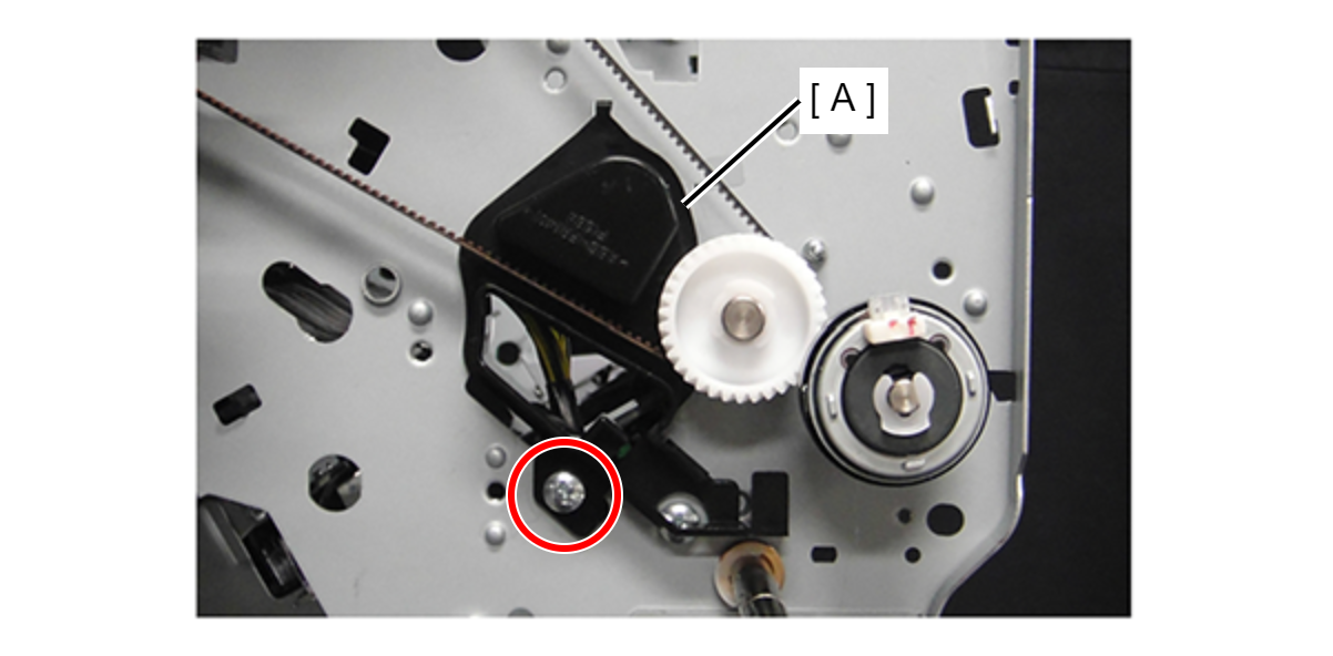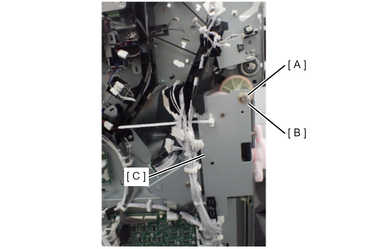 拆下2颗螺丝,然后拆下纸捆排出单元提升电机(B)。(SX: