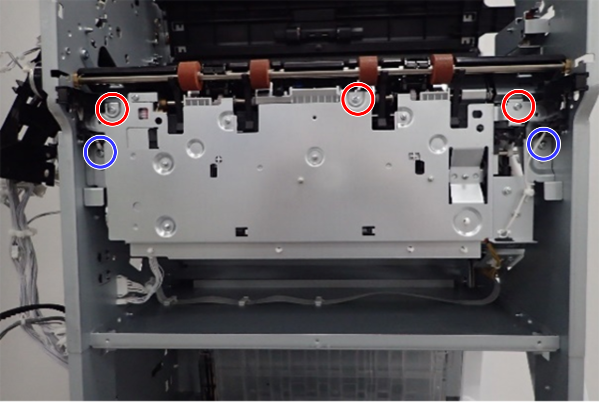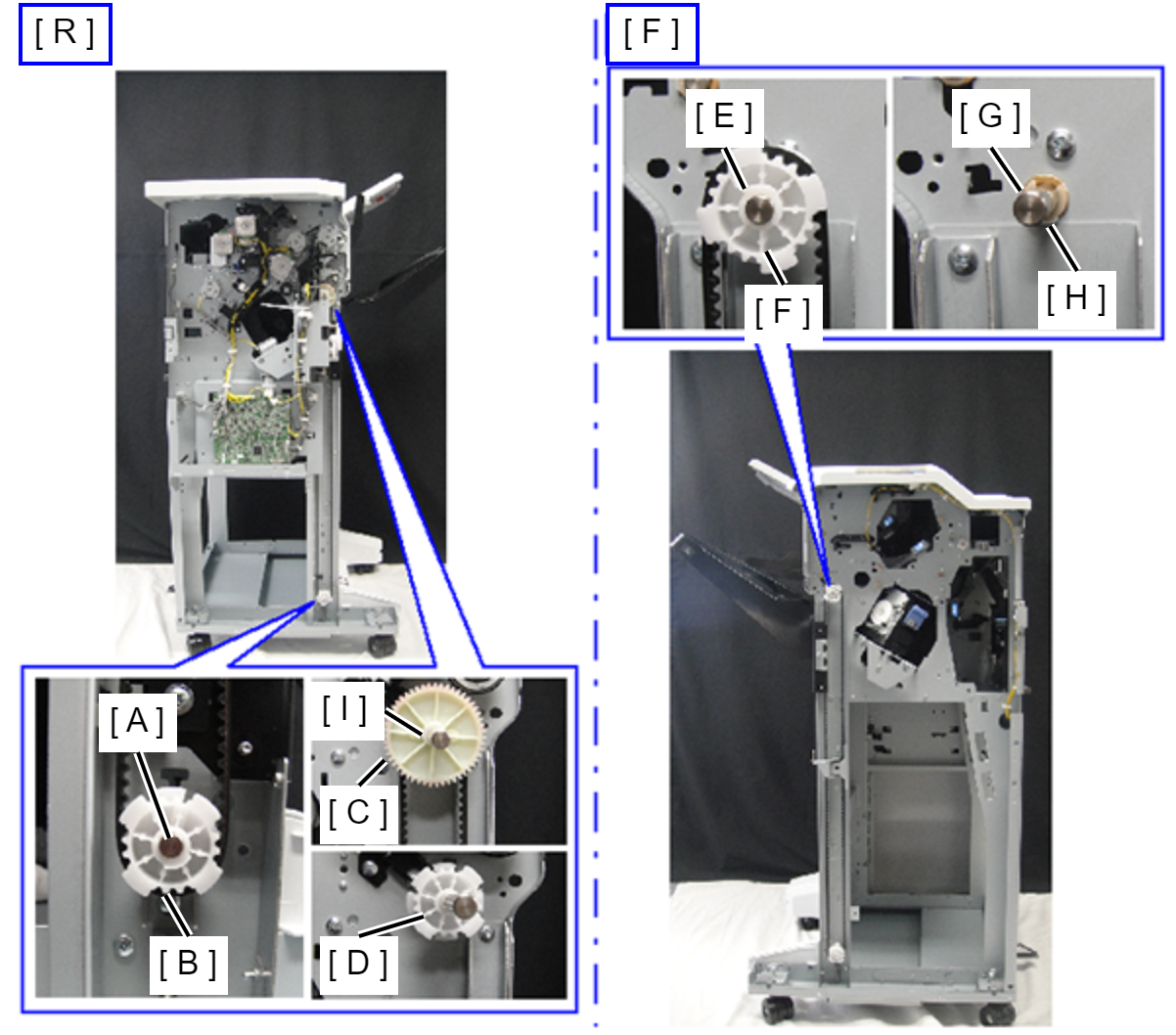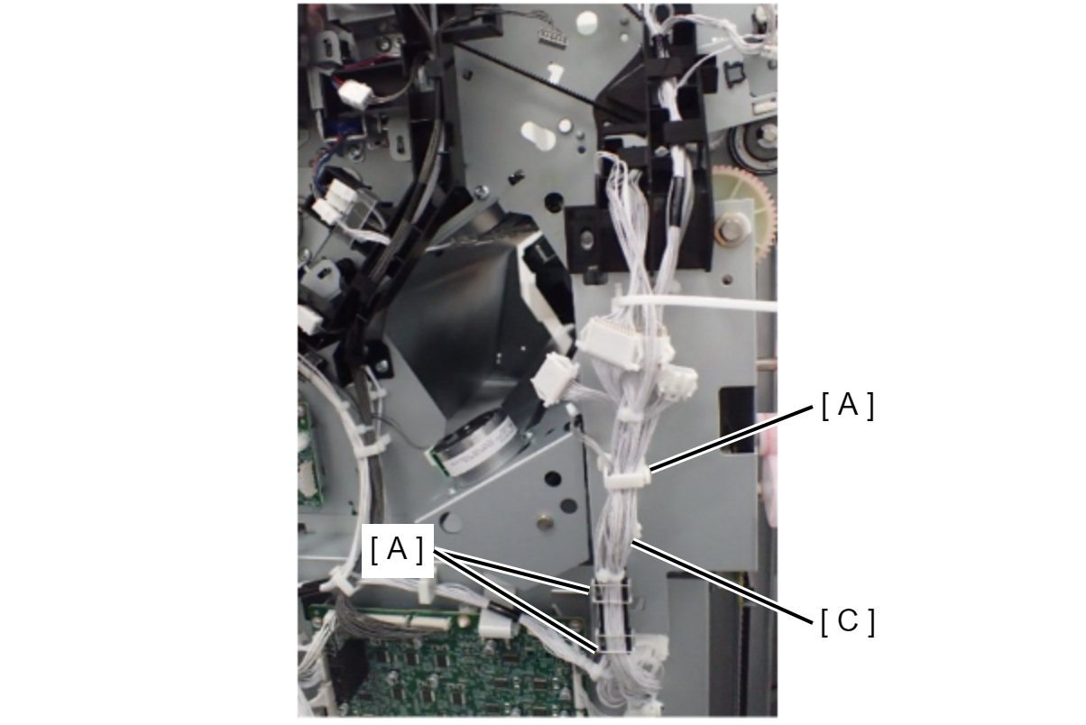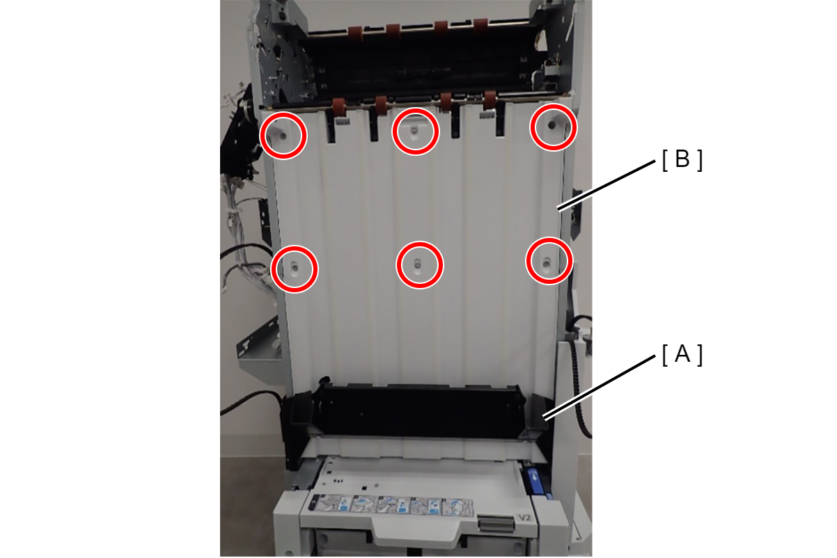拆下2颗螺丝,然后拆下纸捆排出单元提升电机(B)。(SX:
