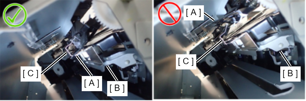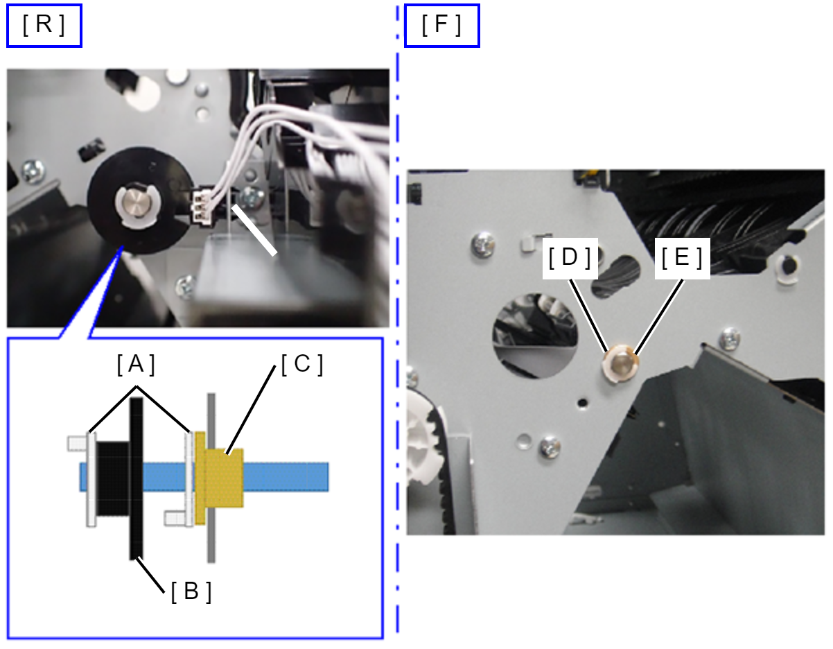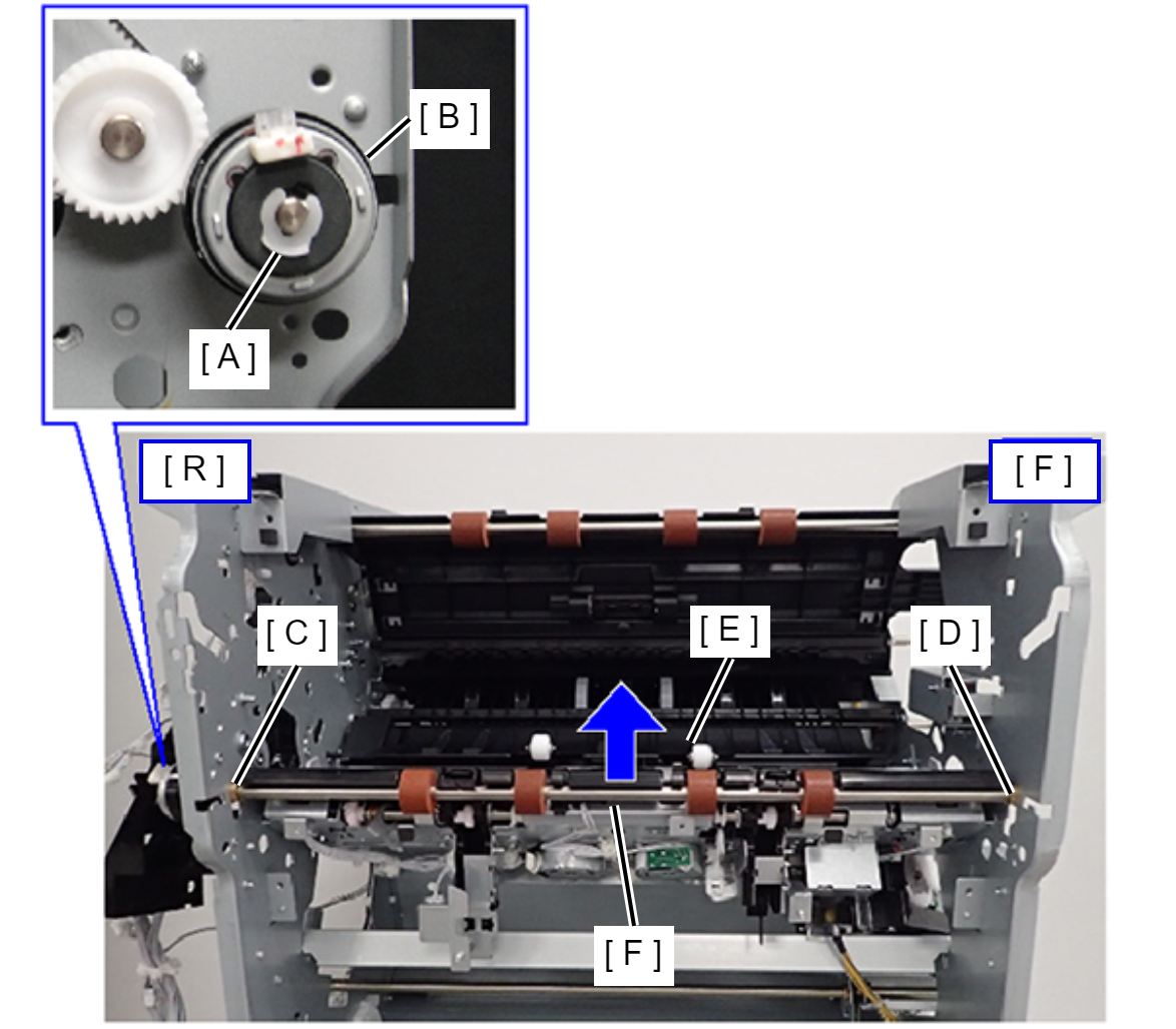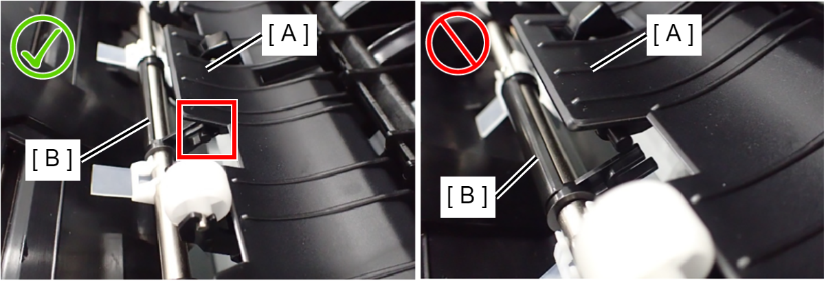 Assembly / 組み立て- 组装时,检查桨片轴组件的纸张固定板(A)是否插入导纸轨(B)的框架(C)中。