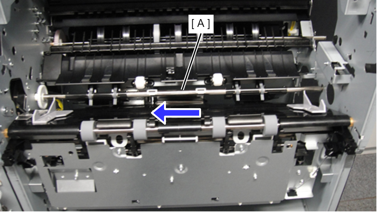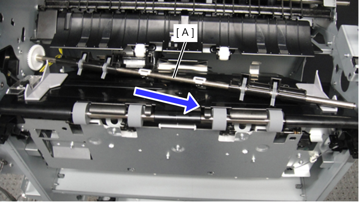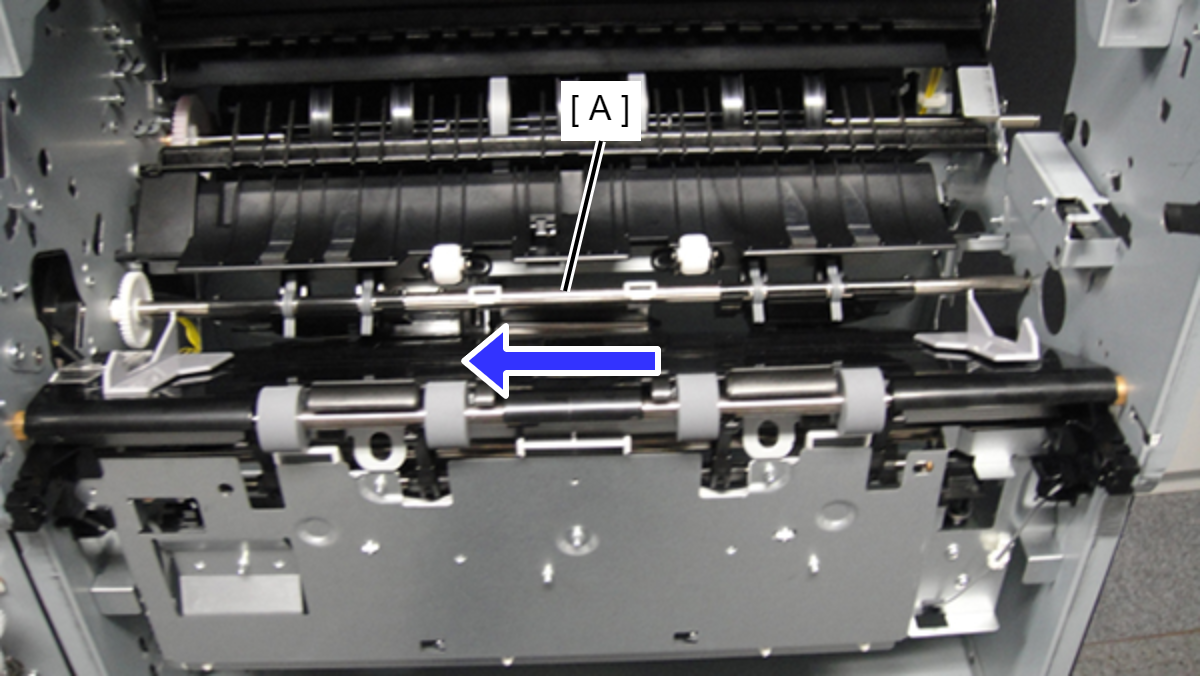- 从一侧的孔中拉出纸捆排出单元提升轴(A),将其拆下。