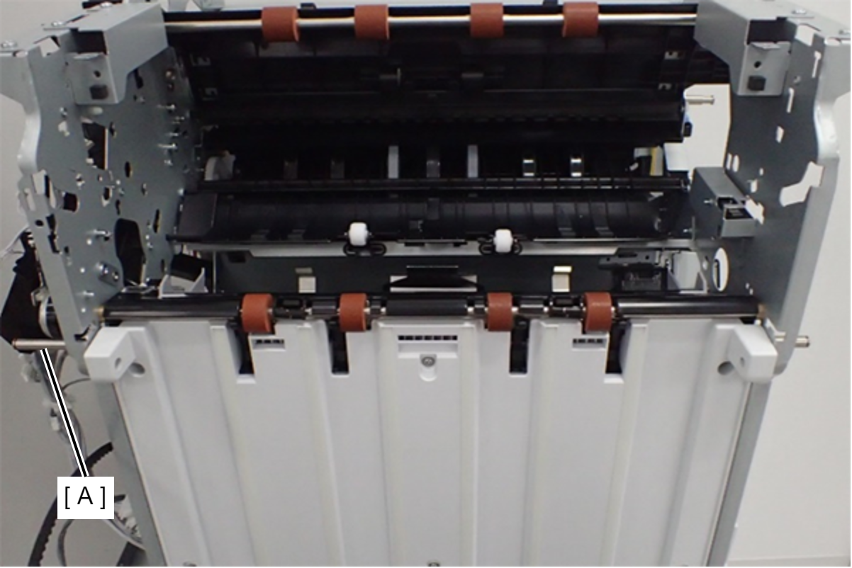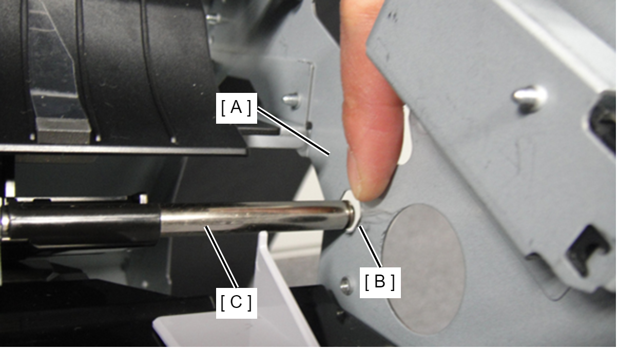 为防止弹簧弄丢,将弹簧(A)挂在纸捆排出单元一侧的轴(B)上。