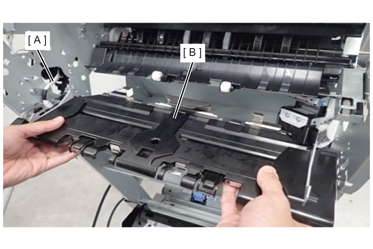 沿箭头方向弯曲下文档出纸盖(A),同时拆卸上文档出纸托盘基座(B)。