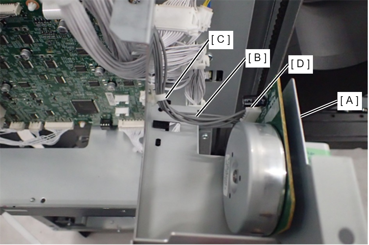 - 从金属板拆下固定托盘电机组件(A)电缆(B)的电缆(B),然后从连接器(D)断开电缆(B)。