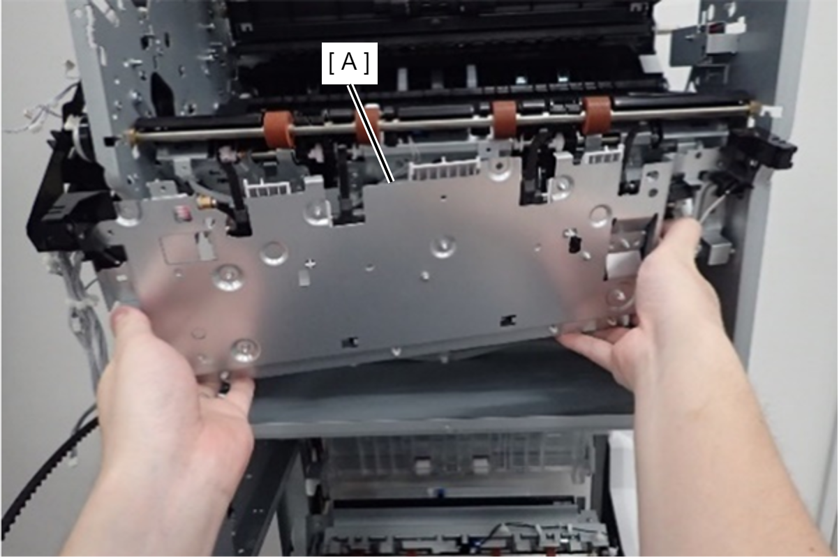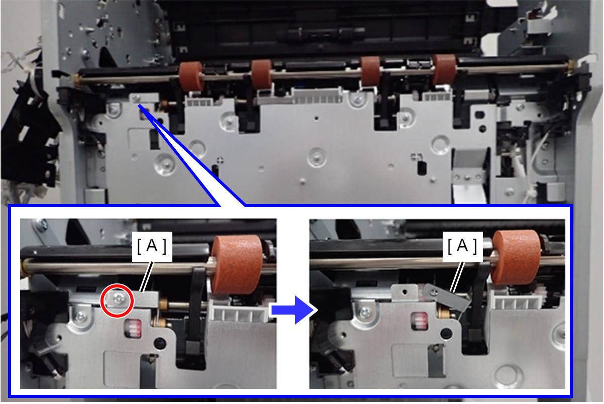 - 释放前侧的定位销,拆下D4卡纸释放导轨(A)。