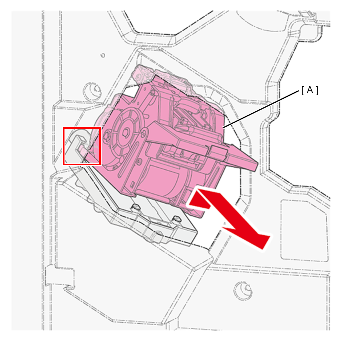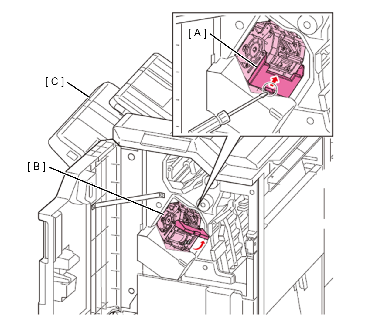 抬起装订器单元(A)的前部,释放卡钩并拆下装订器单元(A)。