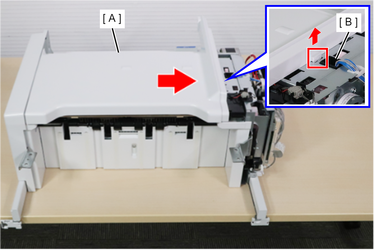 打开前外罩(A)的右侧,将其向左滑动,解除与轨道(B)的干扰,然后拆下前外罩(A)。