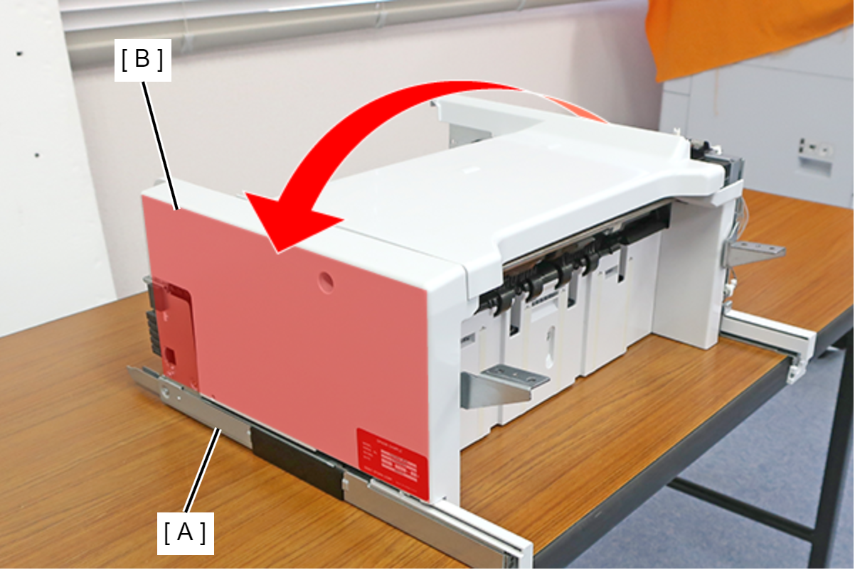- 将装订器单元(A)向左(从上方看去)旋转90度,使其朝向侧面。