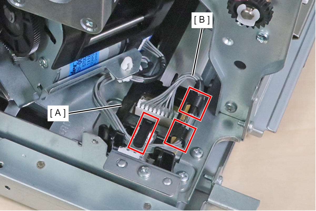 - 从装订器单元(A)断开2根电缆(B)。