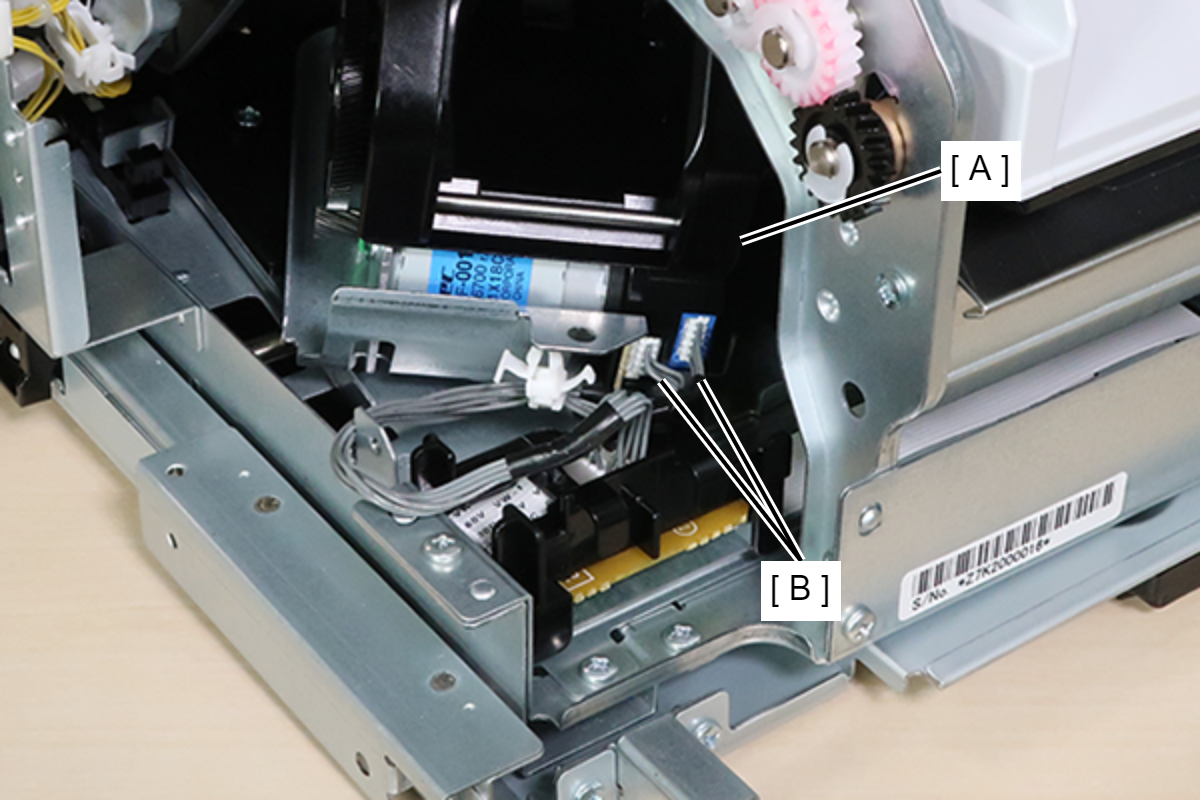 Caution / 注意移动装订器字车时,注意不要使拆下的电缆(A)被框架卡住或夹住而导致损坏。