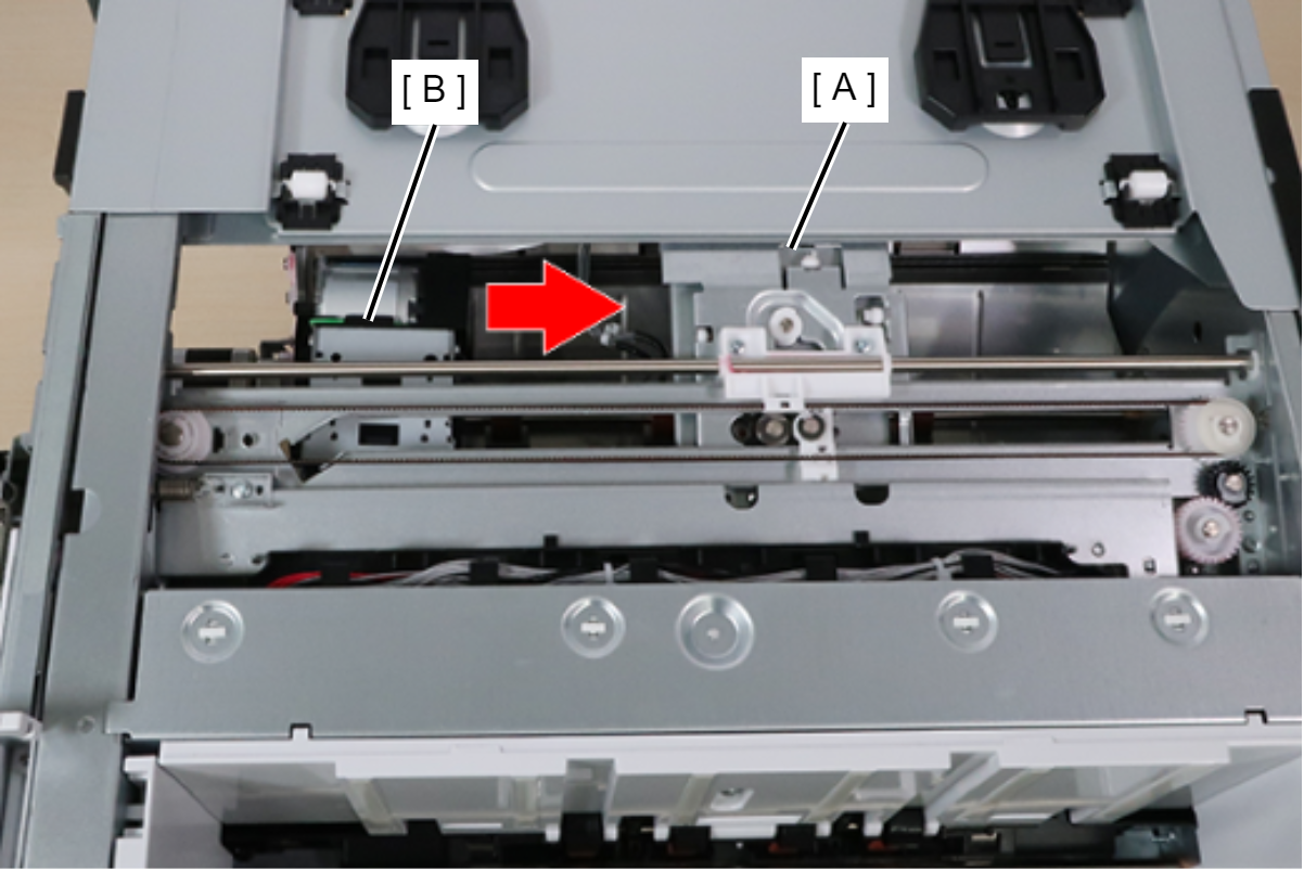 - 将装订器字车(A)移动到最右边的位置,不会干扰装订器单元(B)。