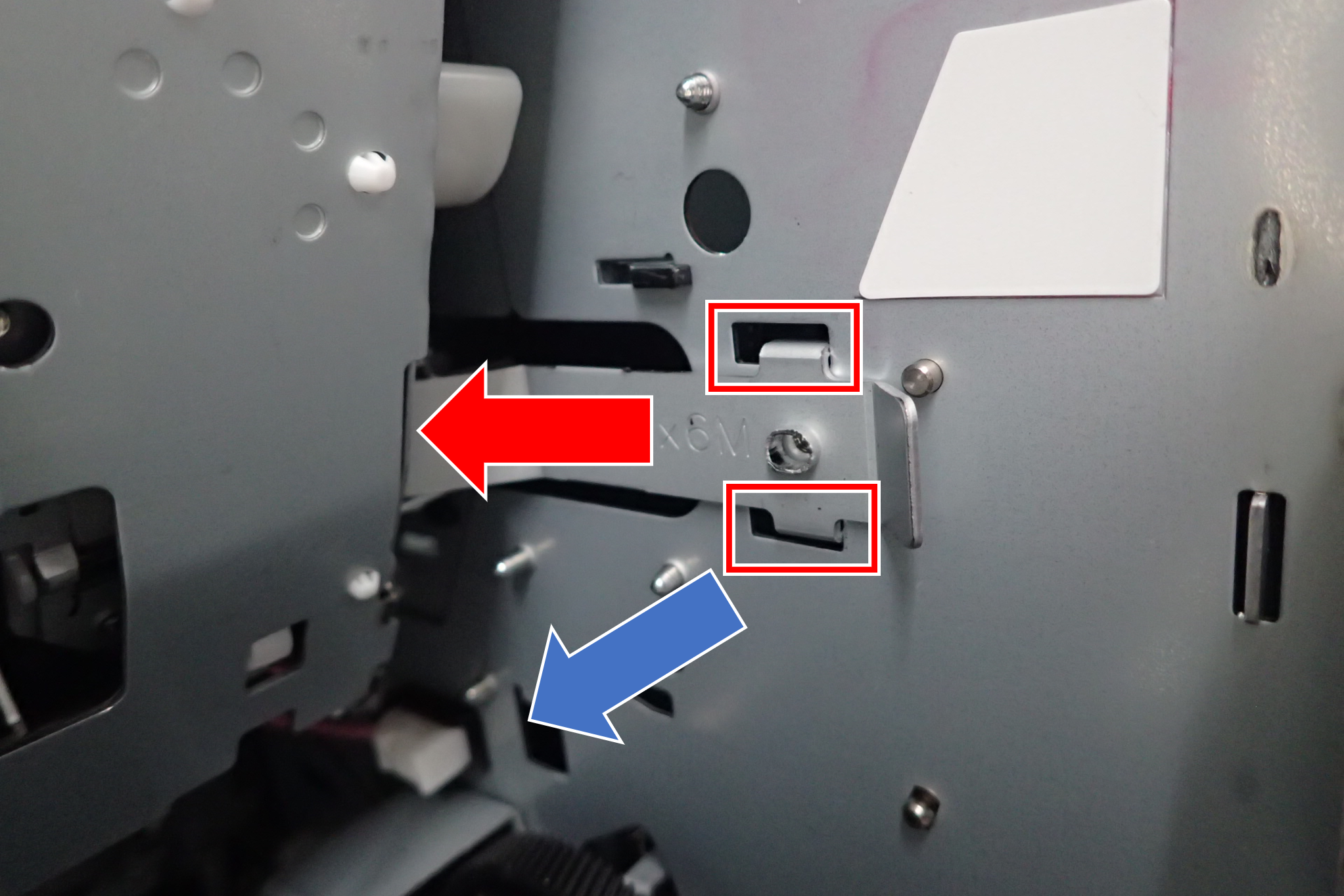 2.在沿红色箭头方向滑动的同时,将其沿蓝色箭头方向移动,释放2个卡钩。