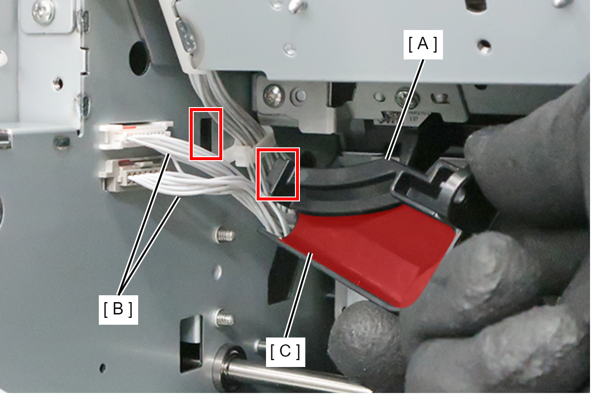 Assembly / 組み立て安装连接器盖(A)时,将卡钩插入主体框架的孔中,并把电缆(B)放在内部(C)。