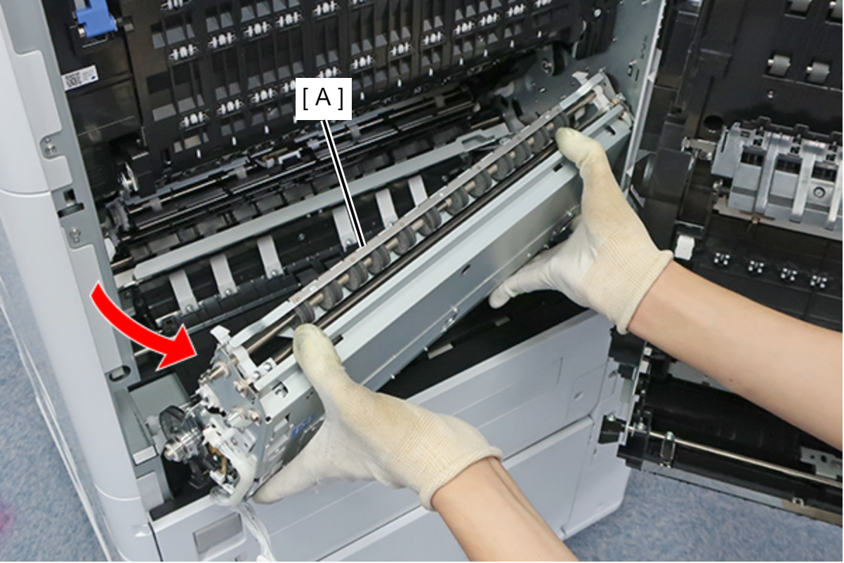 拆下皮带臂(C)时应握住皮带单元(B)。用双手握住皮带单元(A),将其向前方水平地拉出。