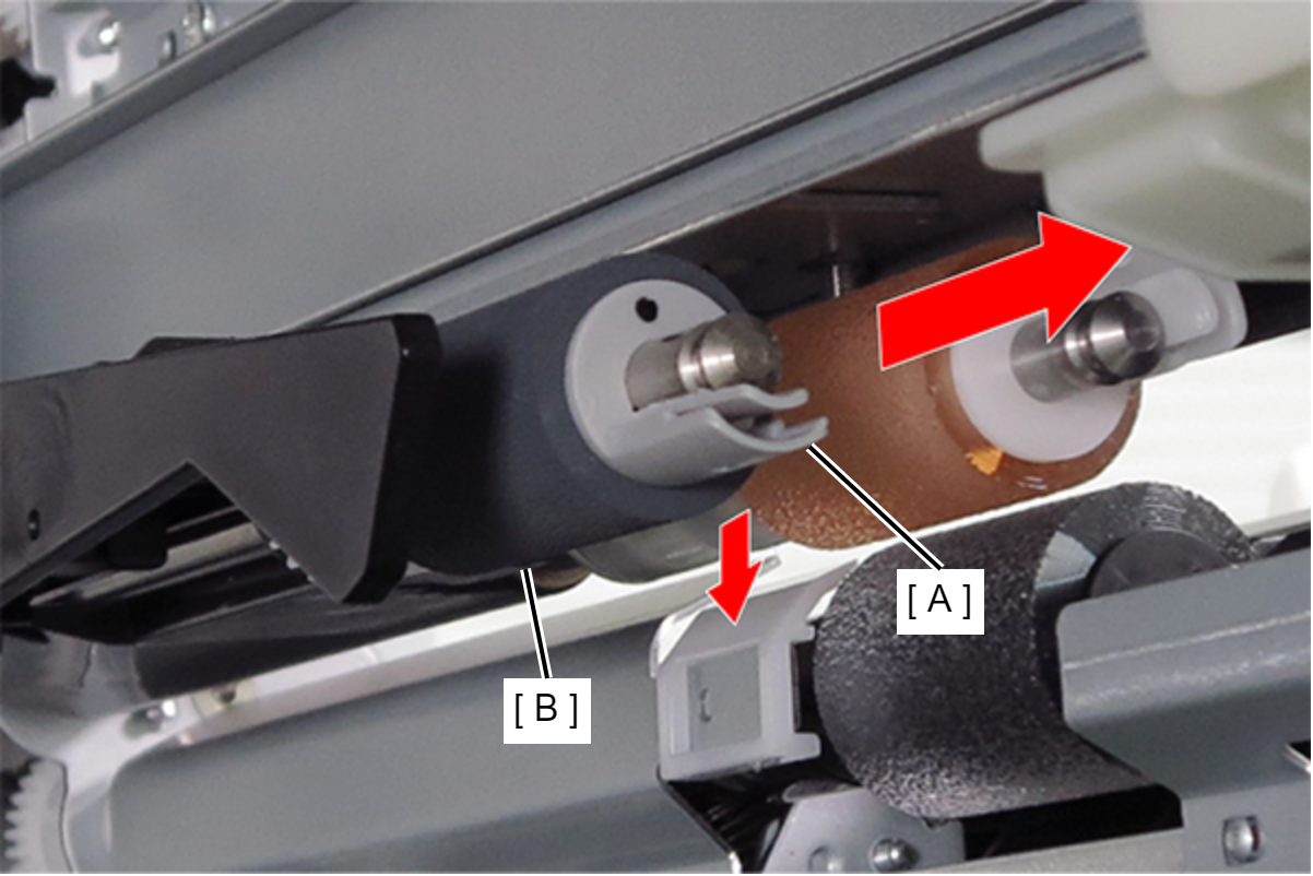 在推卡钩(A)的同时,沿箭头方向拆下C2搓纸辊(B)。