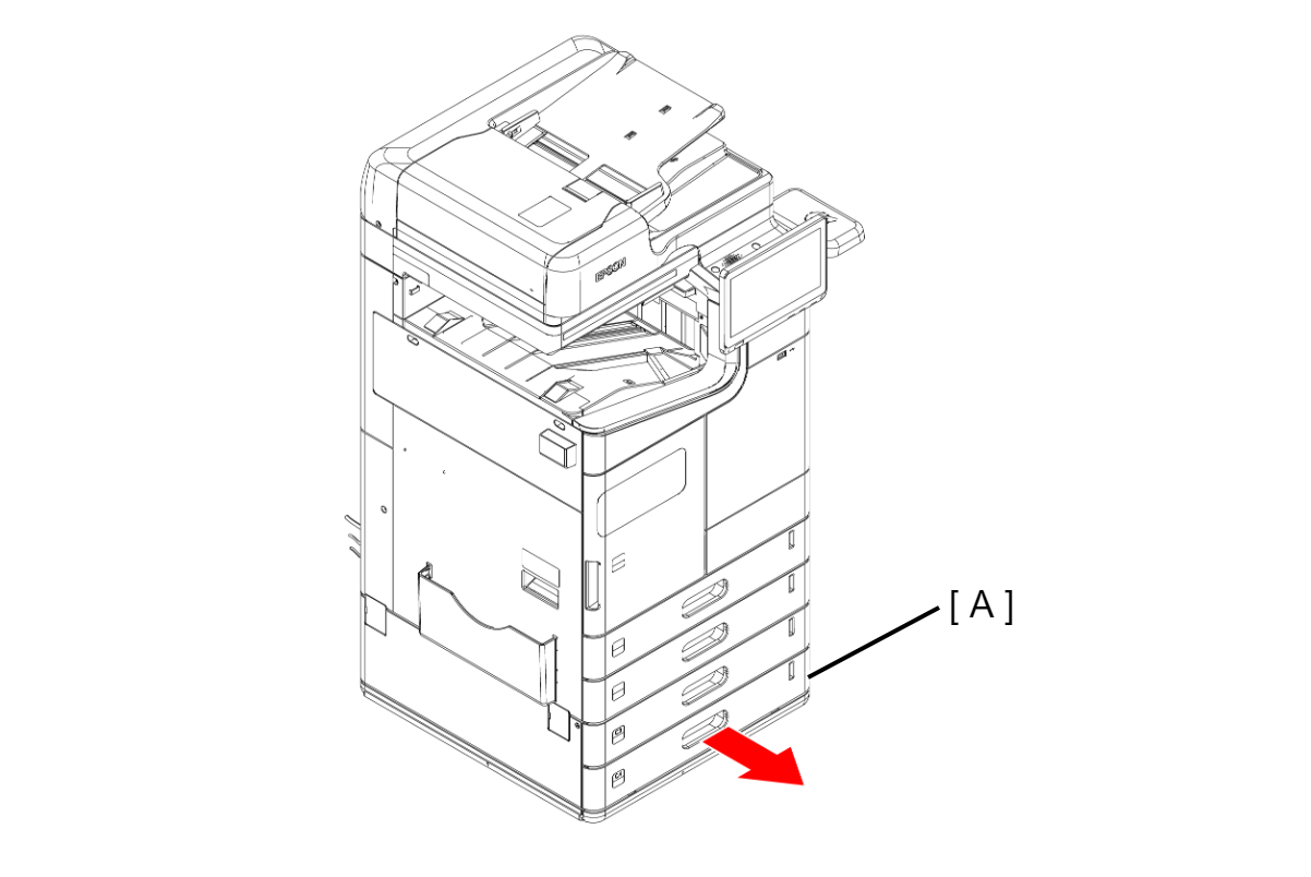 在推卡钩(A)的同时,沿箭头方向拆下C4搓纸辊(B)。