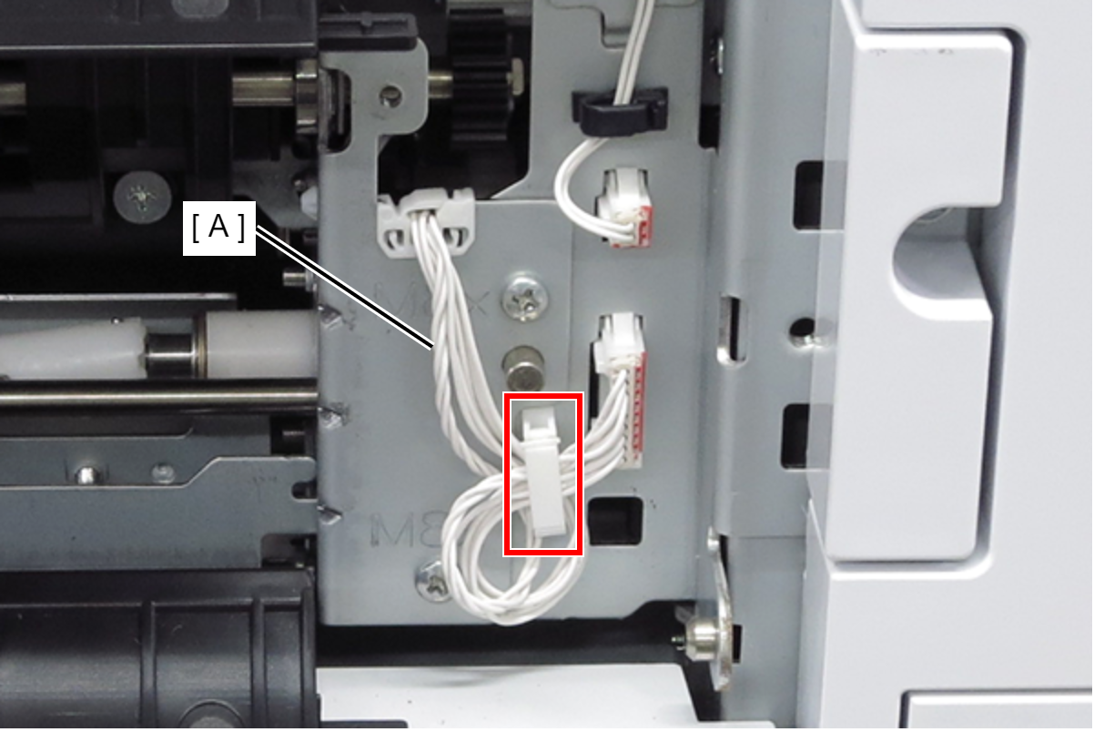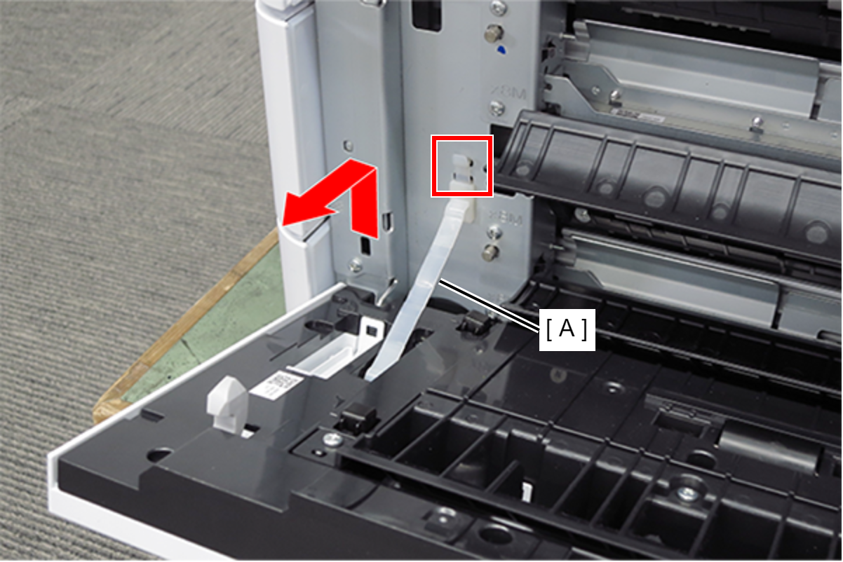 - 从左轴拆下C2搓纸单元(A),将其沿箭头方向拆下。