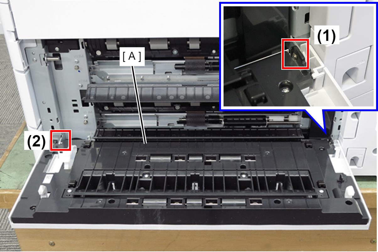 - 按照下图所示的顺序,从主机的两根轴释放并拆下主机进纸盖(A)。
