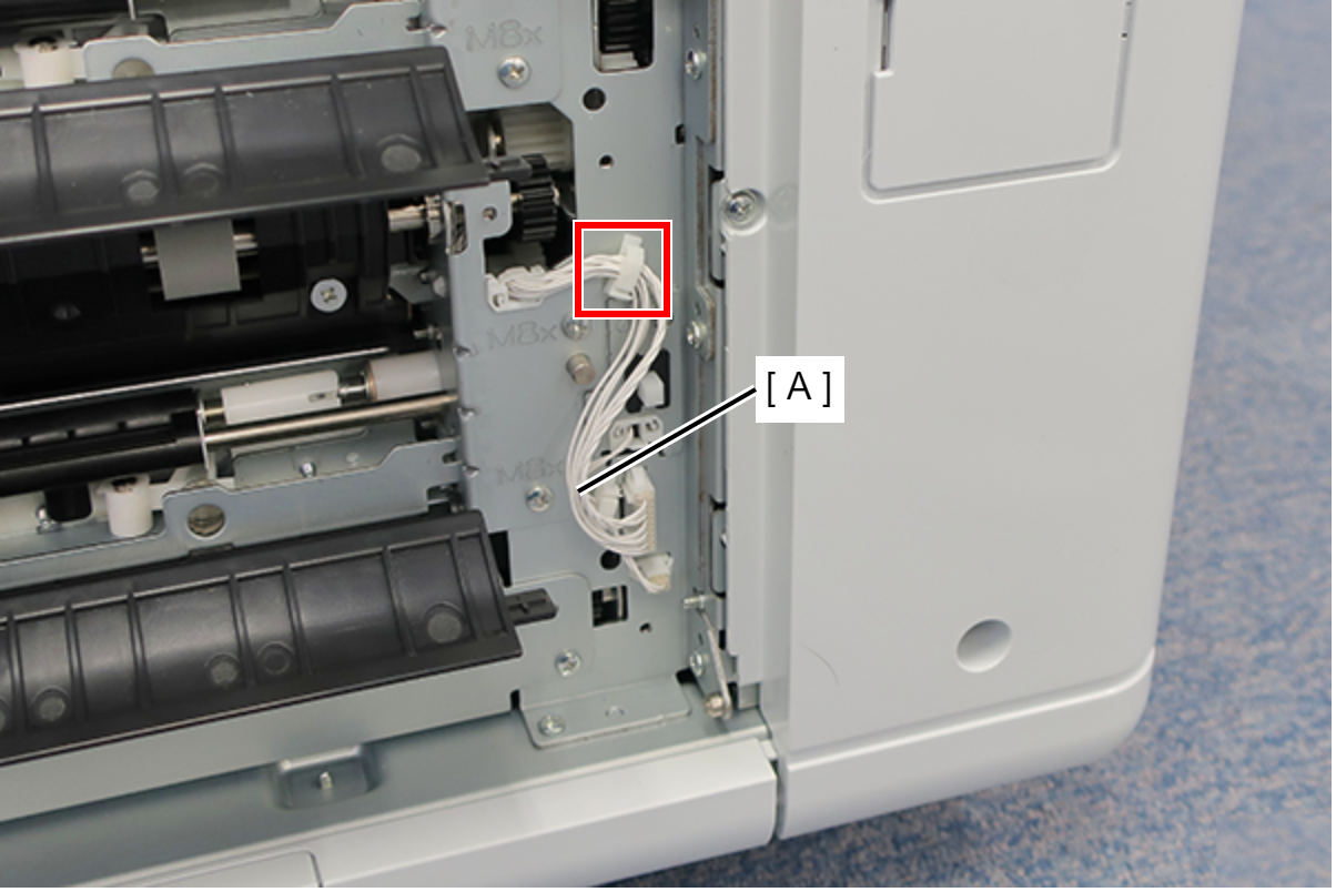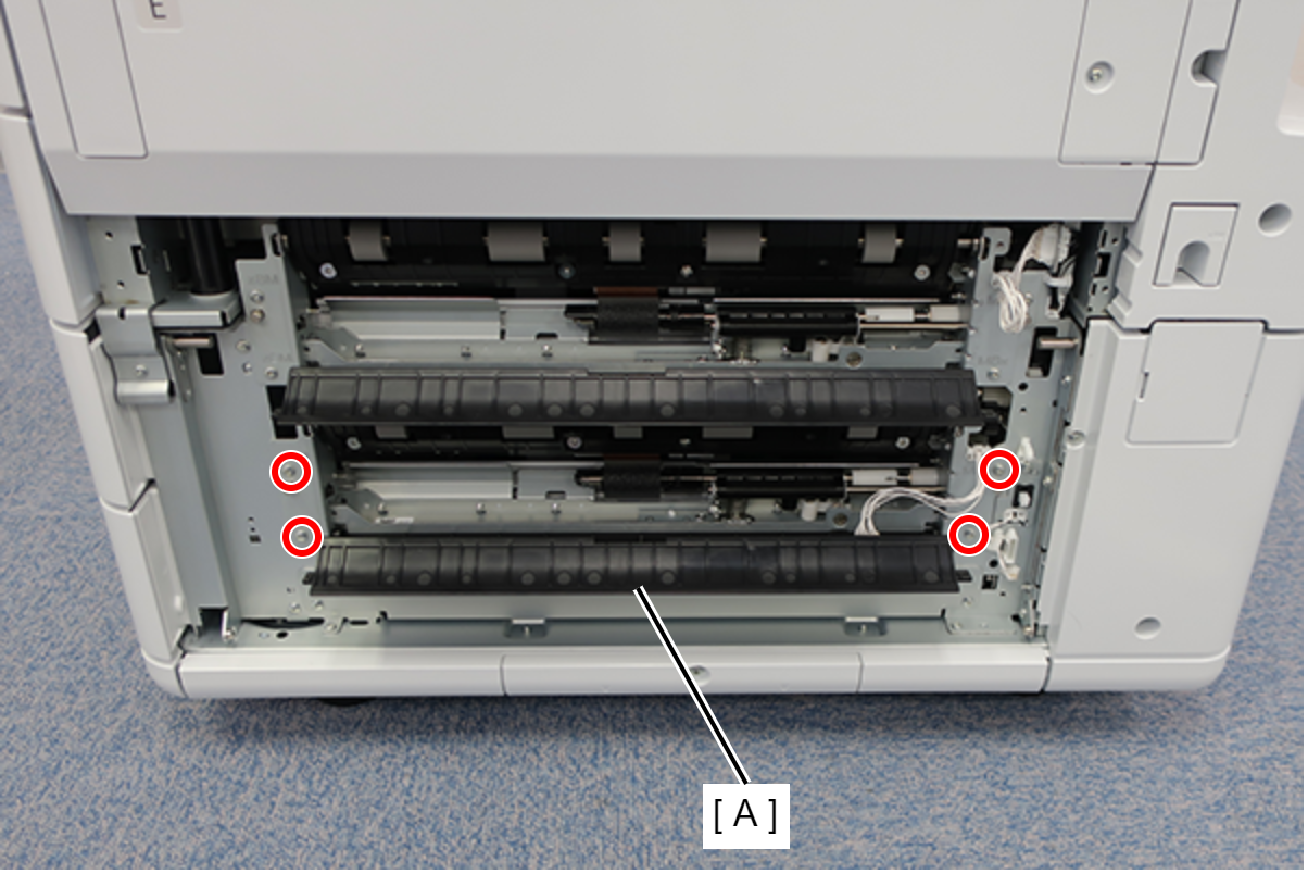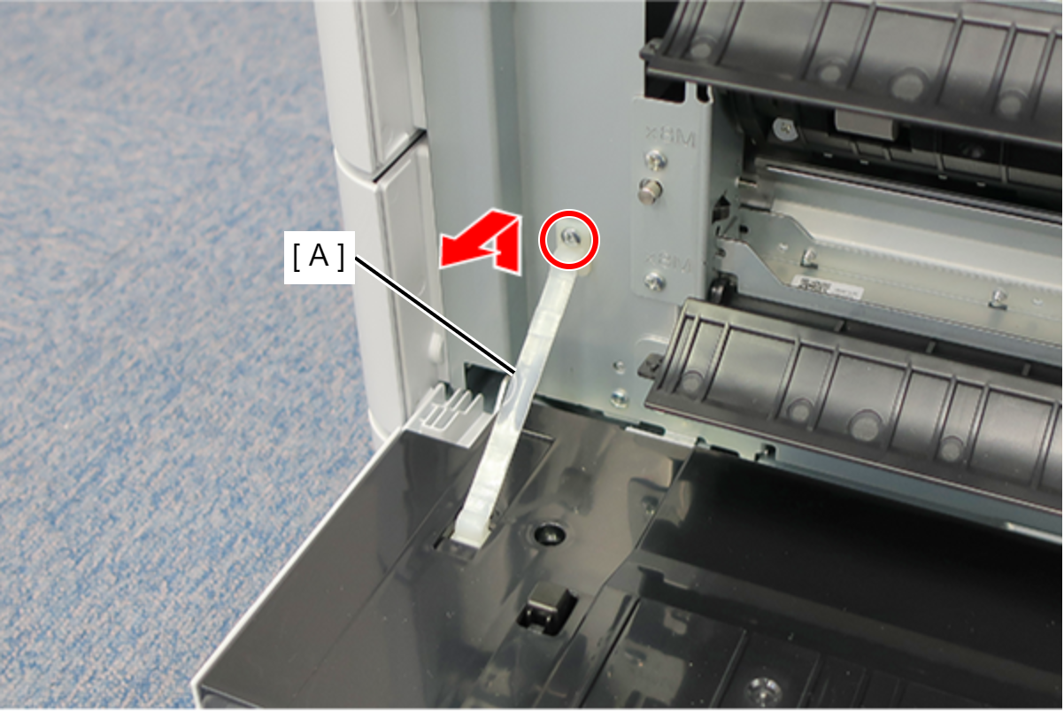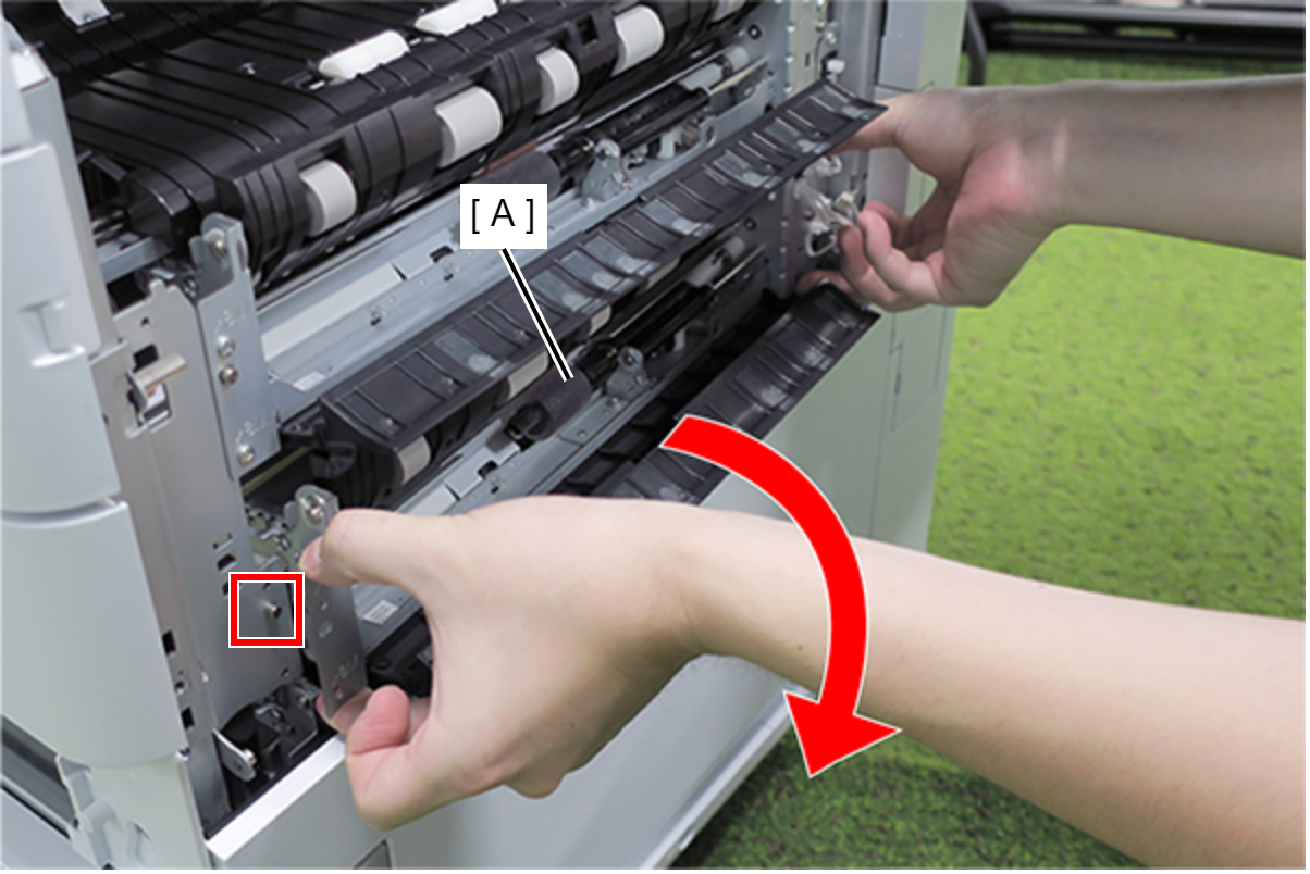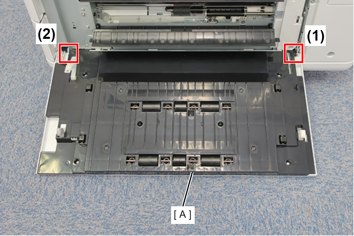 - 按照下图所示的顺序,从主机的两根轴释放并拆下新增纸盒进纸盖(A)。
