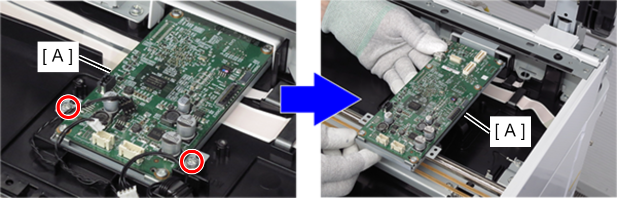- 拆下2颗螺丝,然后从前方拆下SCN板(A)。(S25: