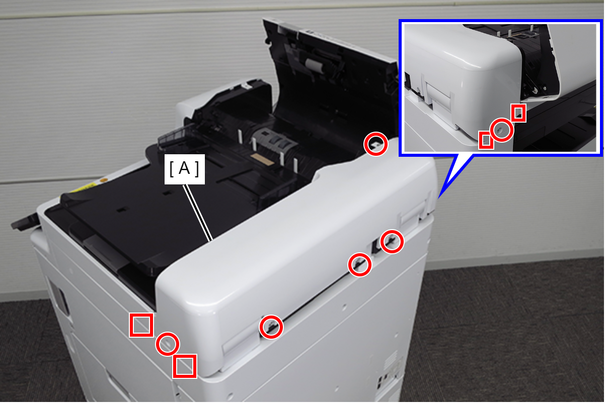 - 拆下固定ADF后盖(A)的6颗螺丝,然后释放4个卡钩。(S7: