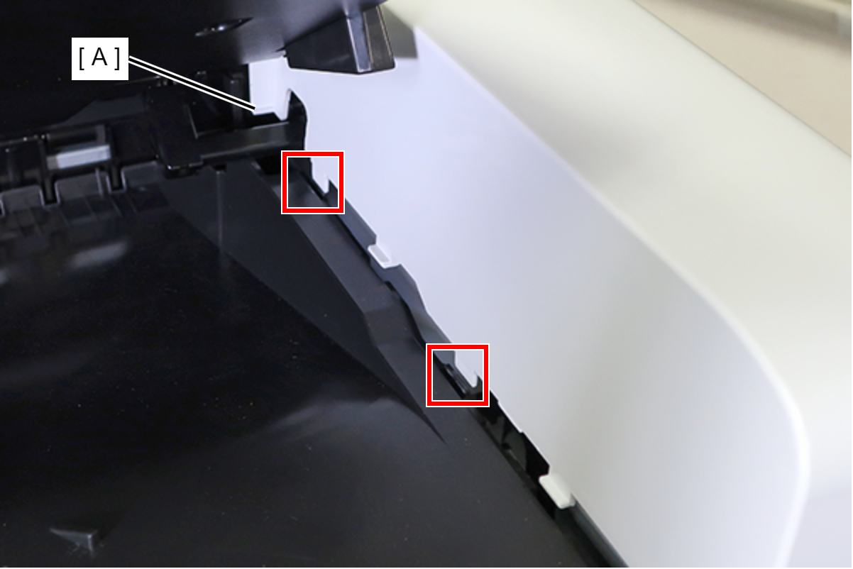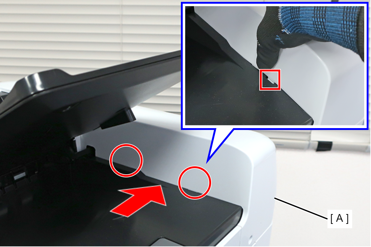 Assembly / 組み立て安装ADF后盖(A)时,将两个卡扣插入孔中。