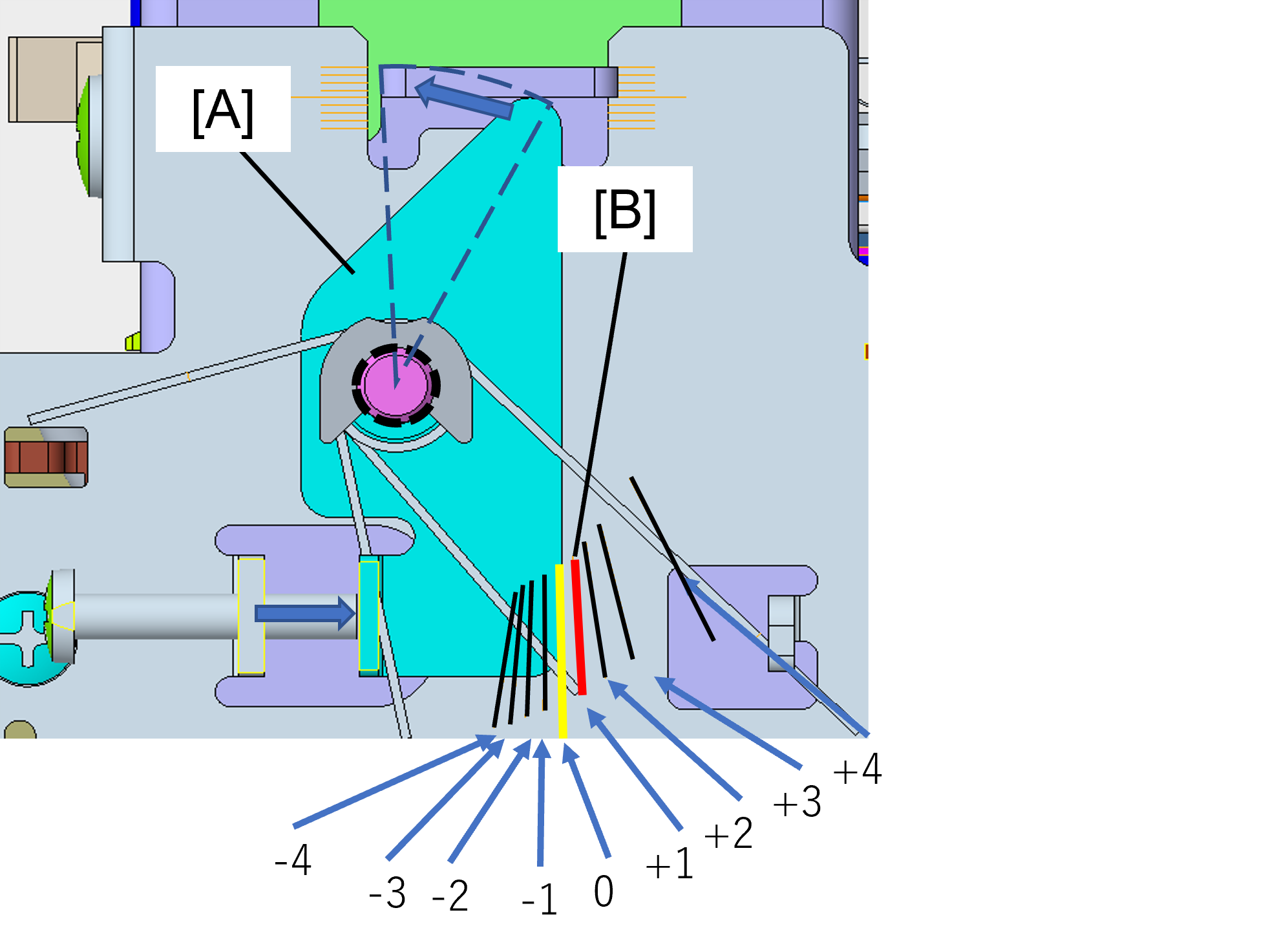 - 拆下1颗螺丝并拆下2个调整垫片(A)。(S4: