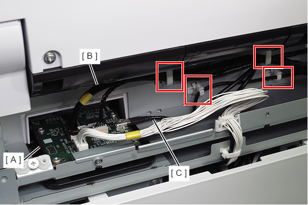 - 从SCN主板(A)上的连接器(CN300、CN302)拆下电缆(B、C)。