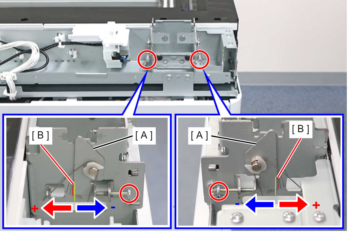 安装ADF单元时,按照以下步骤执行调整。 - 转动SCN左铰链上的两颗高度调整螺丝,将高度调整框架(A)对齐标尺(B)上的+1。