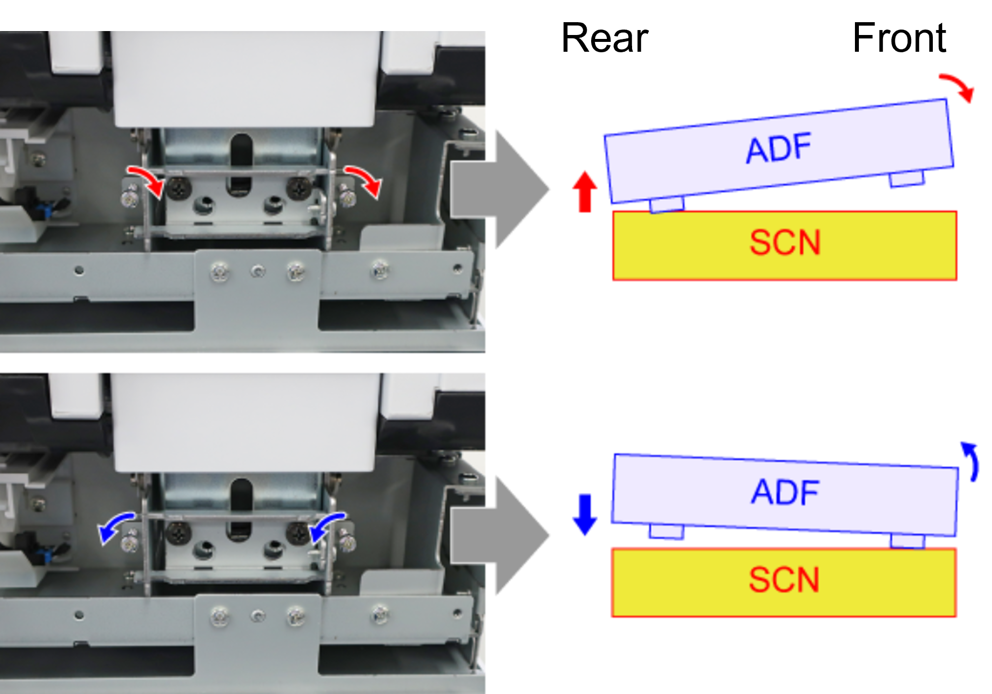 Adjustment / 調整顺时针旋转高度调整螺丝会升高ADF单元的位置,逆时针旋转会降低其位置。