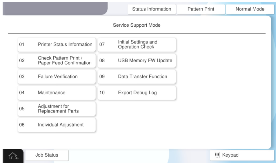 | 02 | 检查图案打印/进纸确认 | 诊断期间(打印质量、纸张通过质量) | 输出诊断图案,检查打印质量,检查主机、ADF和各选件的进纸操作和出纸操作。 |