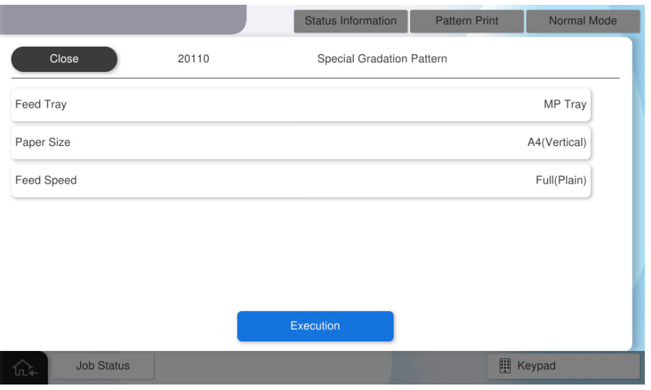 设置项目 选择 进纸托盘 手动进纸器 可用纸张大小 A4(垂直)、Letter(垂直) 打印速度 高速(普通纸)、低速(普通纸)、低速(哑光纸) - 按[Execution](执行)打印图案。