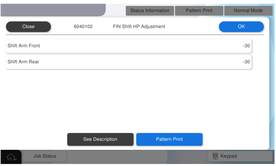 示例)如果移位臂前的调整值是-5,移位臂后的调整值是10,则调整量差异是15。按[Pattern Print](图案打印)应用调整值,并再次打印调整样本。