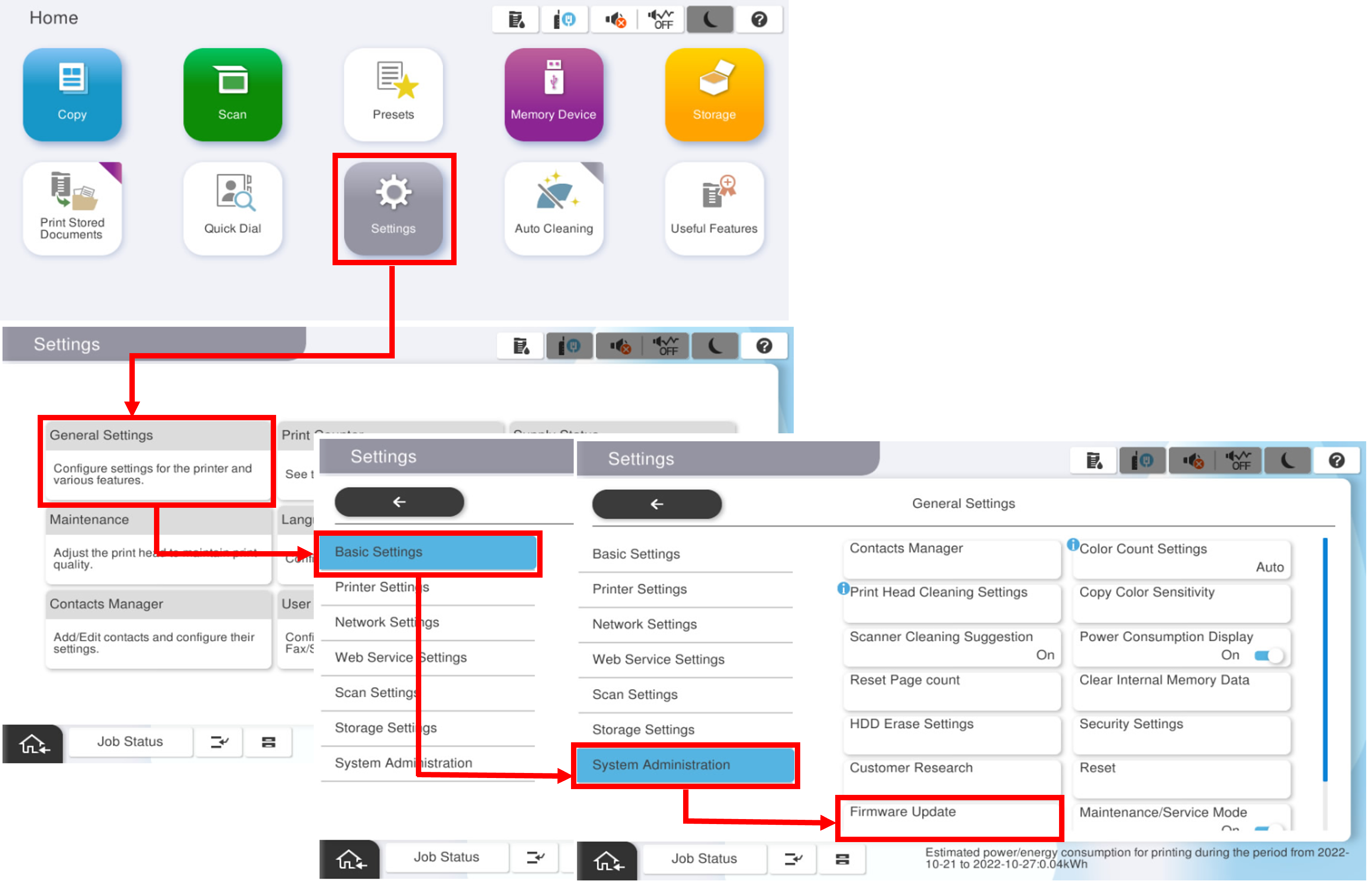 从主界面,[Settings](设置)> [Device Settings](设备设置)> [Administrator Settings](管理员设置)> [Firmware Update](固件更新)