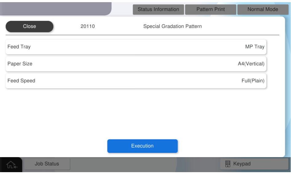 可选项目如下。程序编号 图案名称 设置项目 选择 20110 特殊渐变图案 进纸托盘 手动进纸器 可用纸张大小 A4(垂直)、Letter(垂直) 打印速度 全速(普通纸)、低速(普通纸)、低速(哑光纸) - 按下[Execution](执行)。