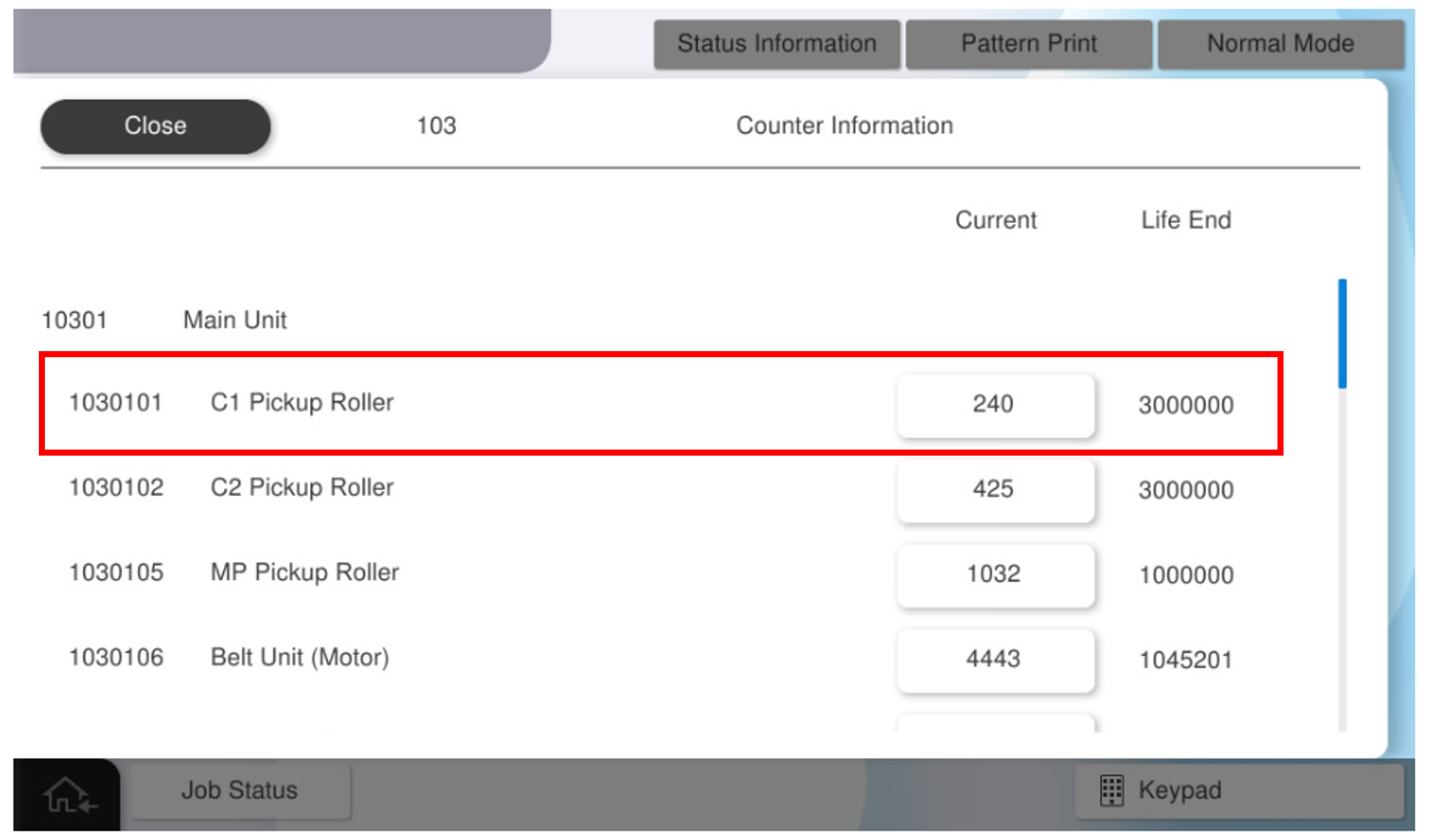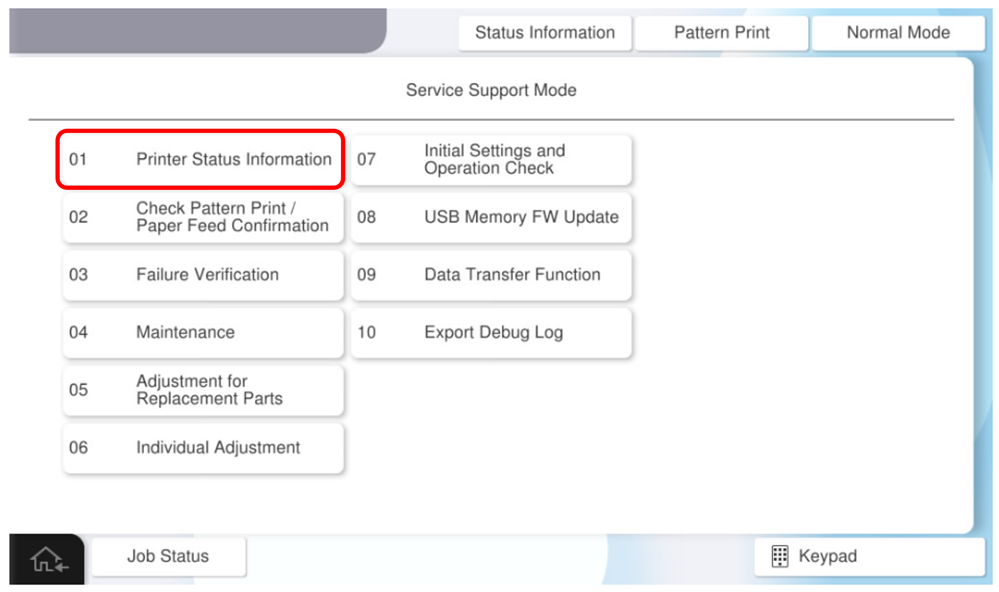 - 选择[01 Printer Status Information](01打印机状态信息)。