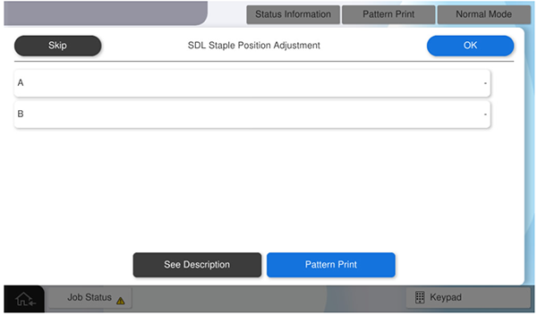 - 检查调整样本,如果装订错位得到改善,按[Skip](跳过)结束调整。