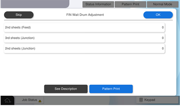 Check Point / チェックポイント通过按[Pattern Print](图案打印)按钮反映调整值。请注意,按[OK](确定)也会反映调整值,但会转换到之前一级的菜单屏幕。