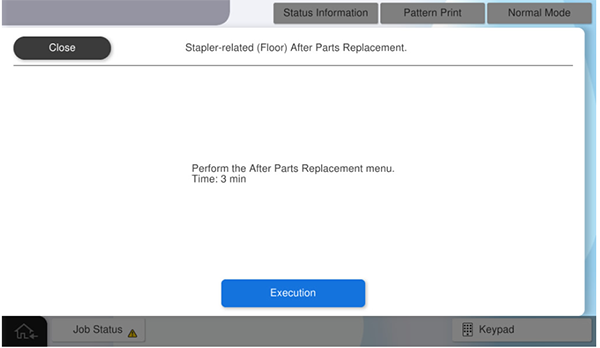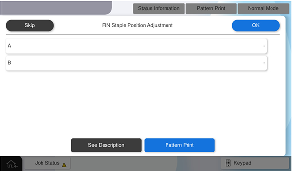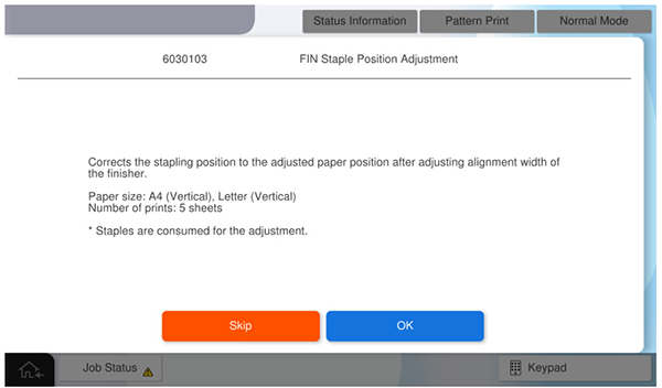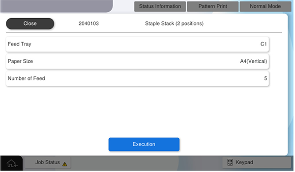 可设置参数如下。设置项目 选择 进纸托盘 C1、C2、C3、C4、手动进纸器、大容量进纸器 可用纸张大小 A4(纵向)、Letter(纵向)、A3、Ledger 张数 5(固定) - 按下[Execution](执行)输出调整样本。