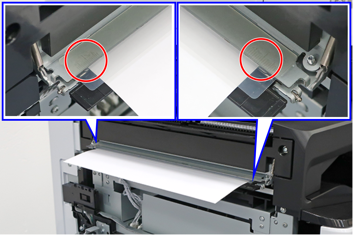 - 检查正面和背面的出纸位置相对于刻度中心向正面或背面移动了几个刻度。