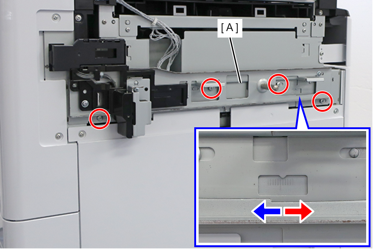 - 松开调整板(A)上的4颗螺丝,按照上一步中确认的刻度移动调整板,然后用4颗螺丝固定。