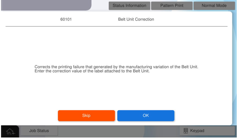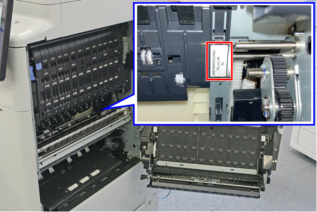 - 打开右门单元和皮带单元,然后检查校正值标签。
