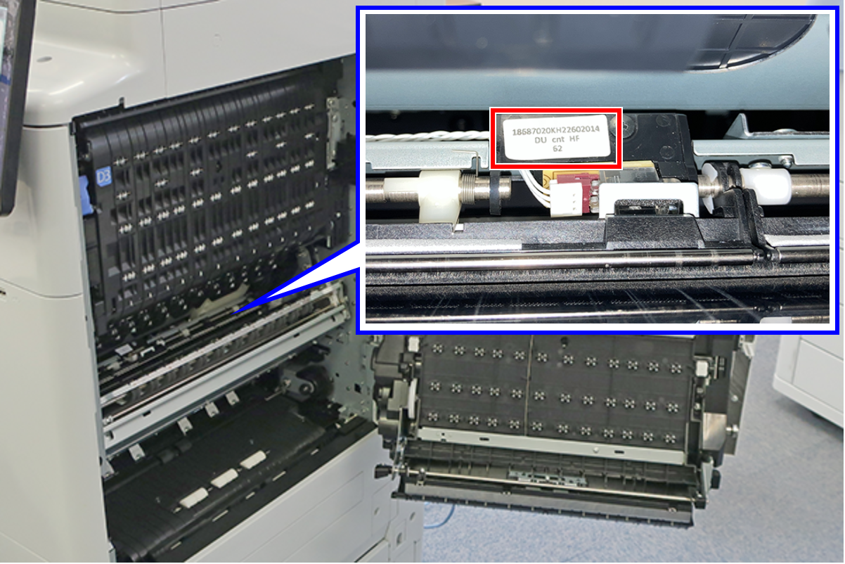 - 打开右门单元和皮带单元,然后检查校正值标签。