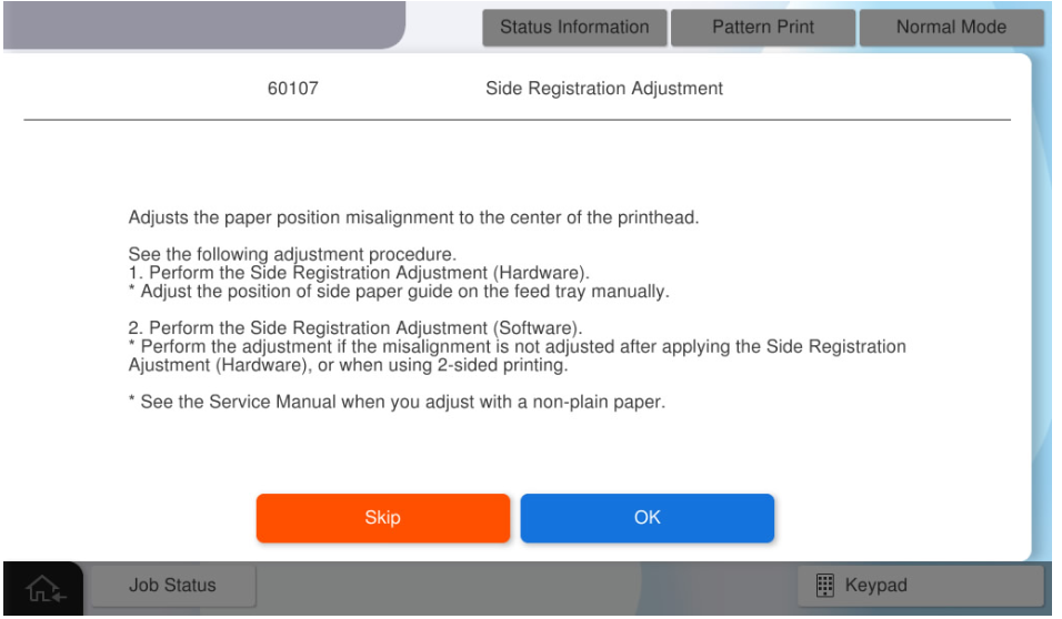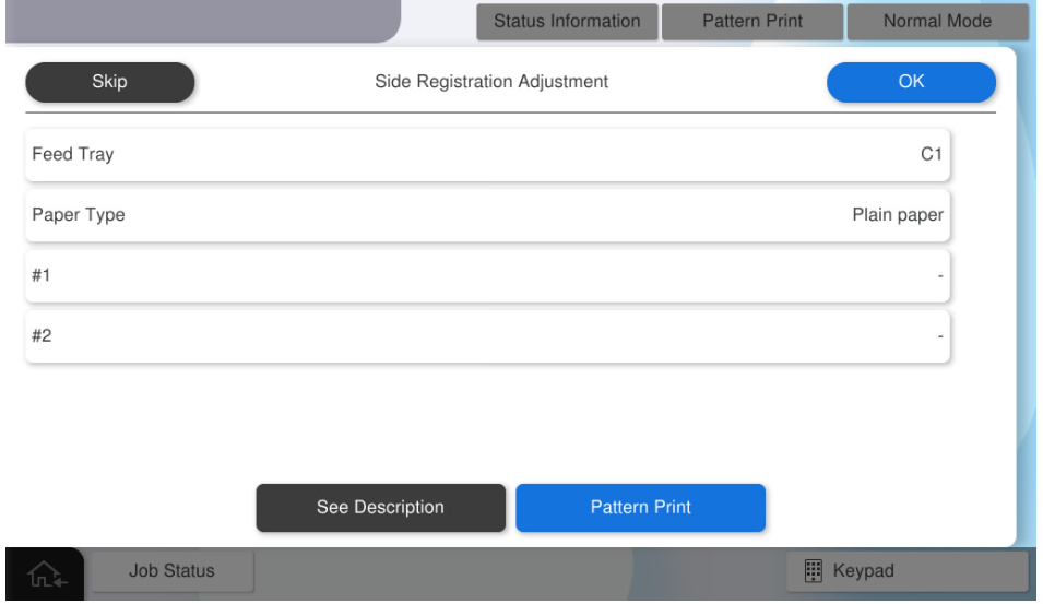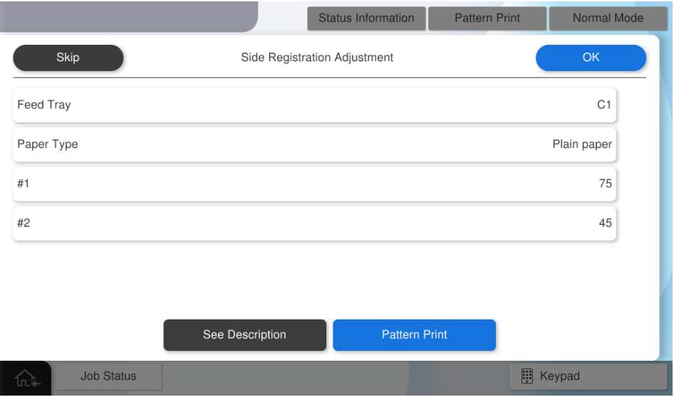 如果在输入所有值后按[Pattern Print](图案打印),将反映调整值。调整值反映后,输入到面板的所有调整值将被清除。按[Skip](跳过)结束调整。