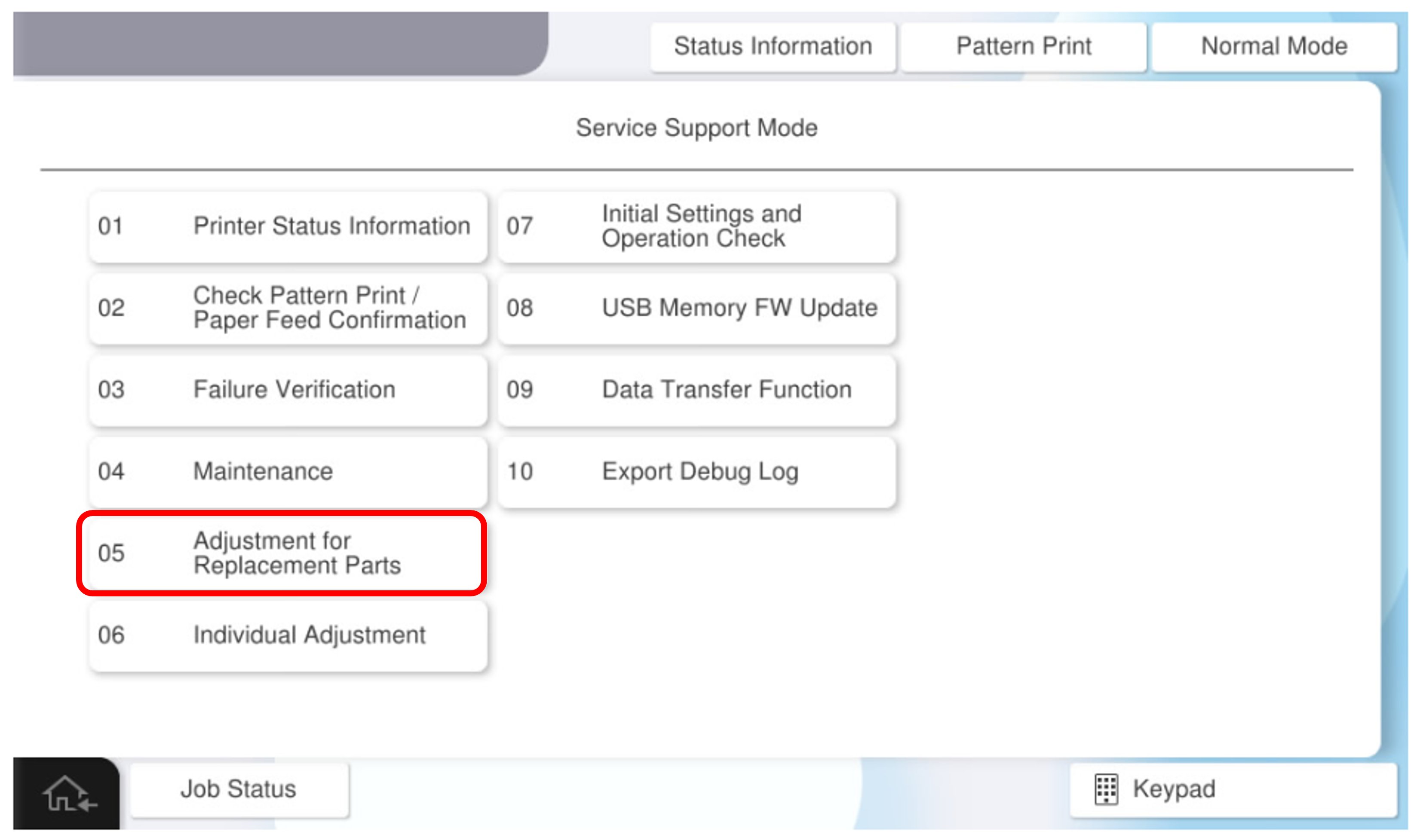 - 选择[05 Adjustment for Replacement Parts](05更换零件的调整)。