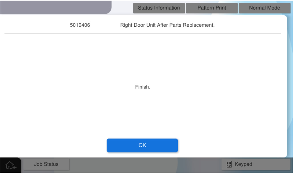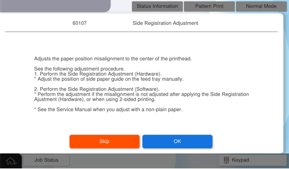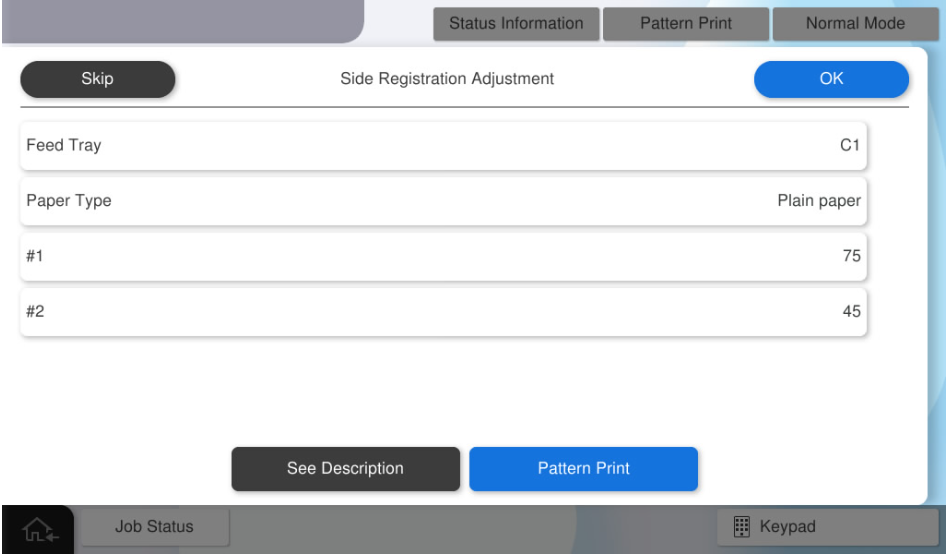 如果在输入所有值后按[Pattern Print](图案打印),将反映调整值。调整值反映后,输入到面板的所有调整值将被清除。按[Skip](跳过)结束调整。