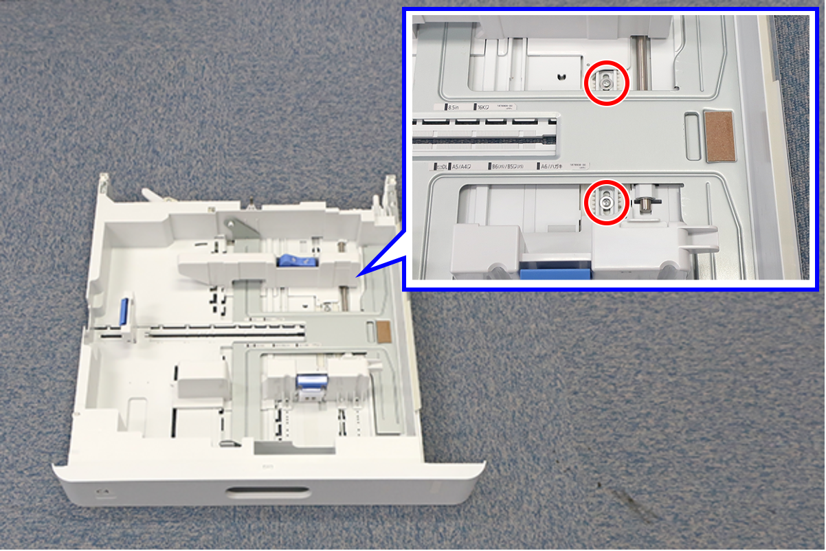 - 松开纸盒单元底部侧面纸导轨的2颗螺丝。
