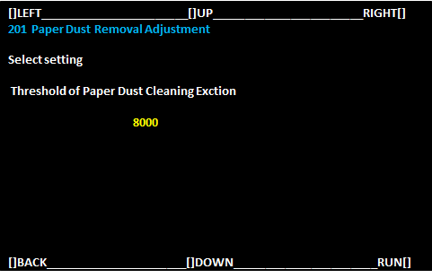 选择[201 Paper Dust Removal Adjustment](201纸尘清除调整),然后选择[RUN](运行)。