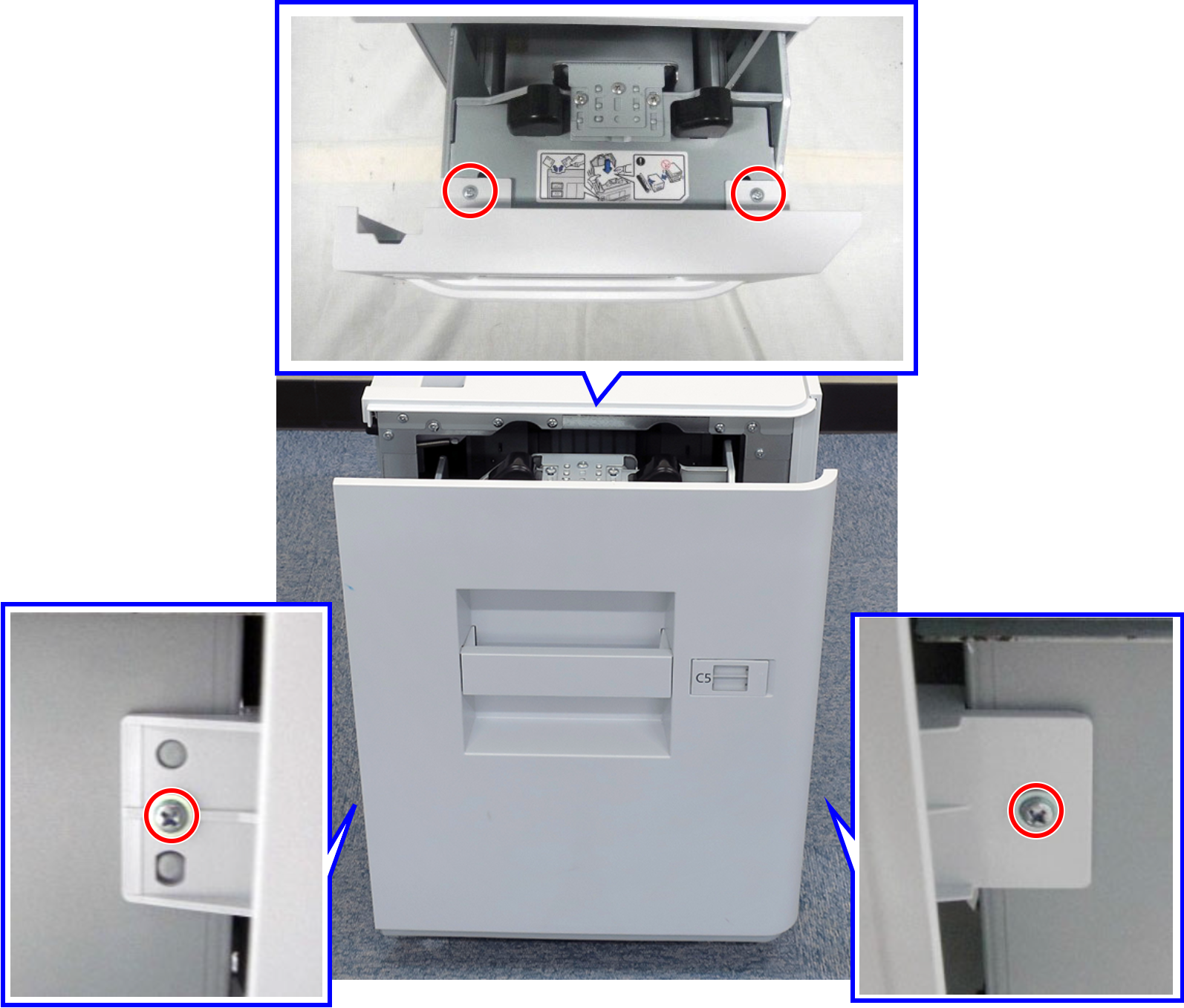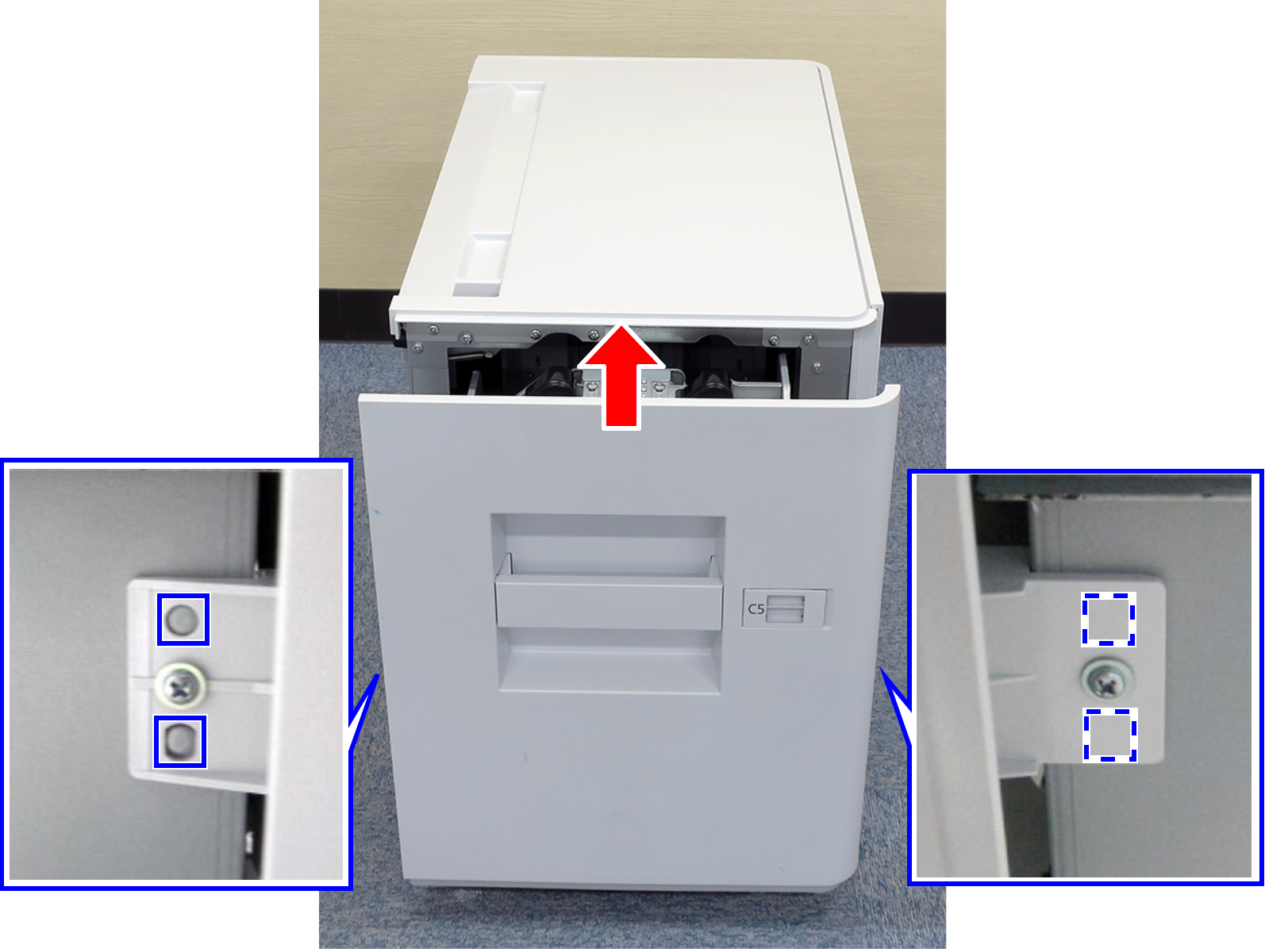 Assemble / 組み立て- 安装大容量进纸器前盖组件时,安装卡钩(2处)然后用装配螺丝将定位销固定在四处。
